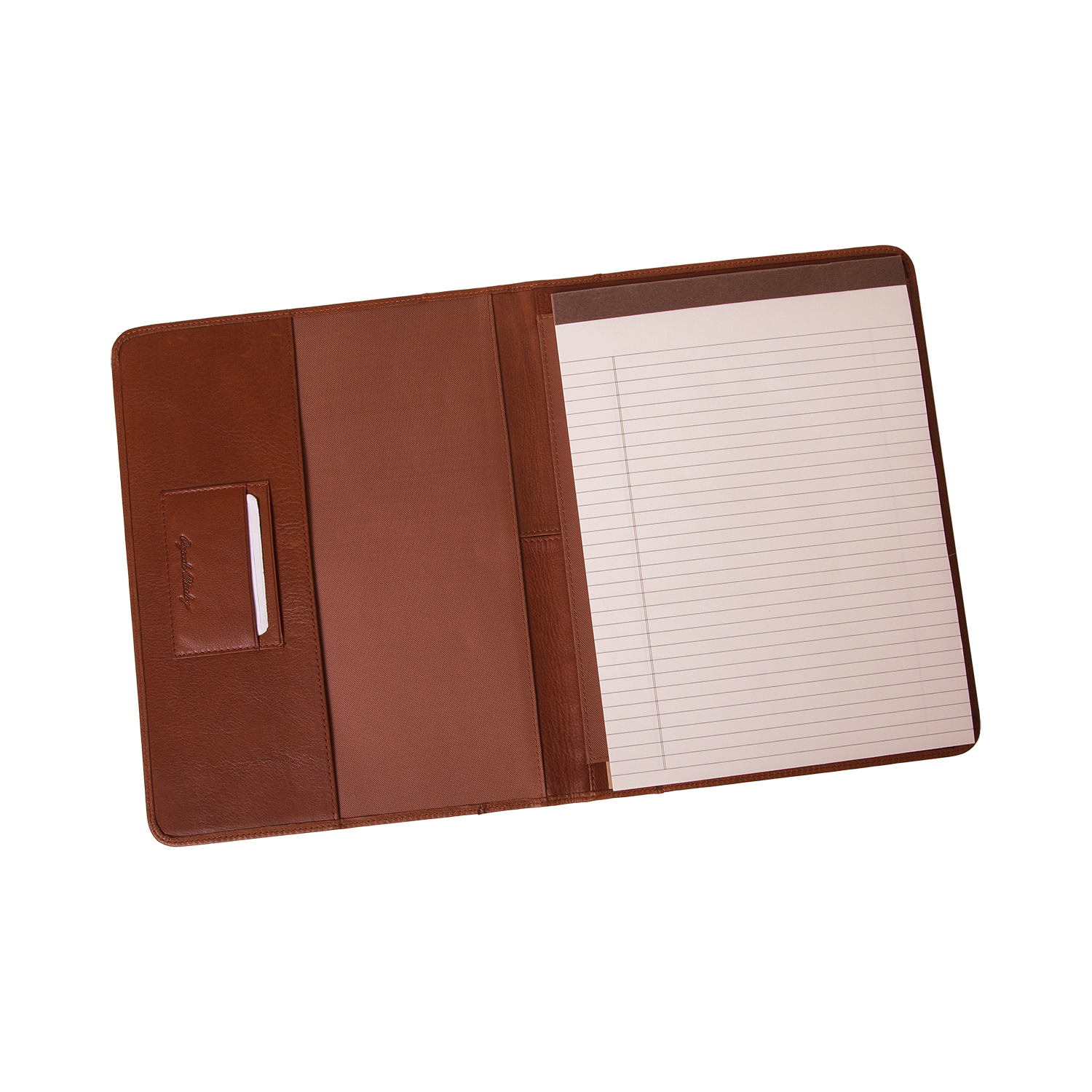 Designed to flip so the writing pad works on either the left or right side. Equipped with two card slots, a pen sleeve. Open and slip-style pockets. It may be personalized.