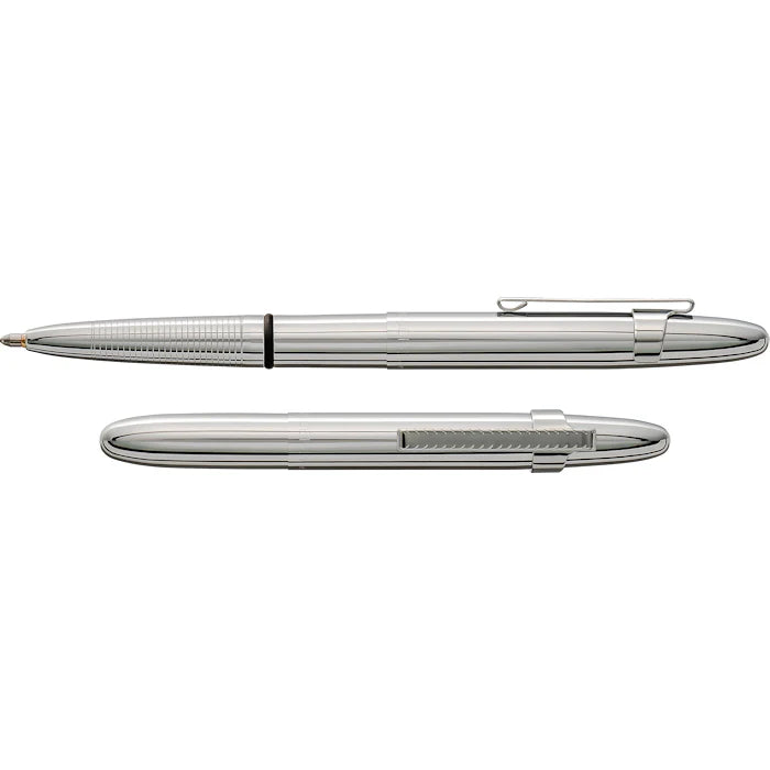 The original Bullet Space Pen was conceived in July of 1948. Paul Fisher was soon machining a new pen design shaped from solid aluminum. It became our first Fisher ball point pen, the 400 Bullet Pen, and arguably the most popular pen of the twentieth century. This pen is now all brass with a chrome finish with a clip.