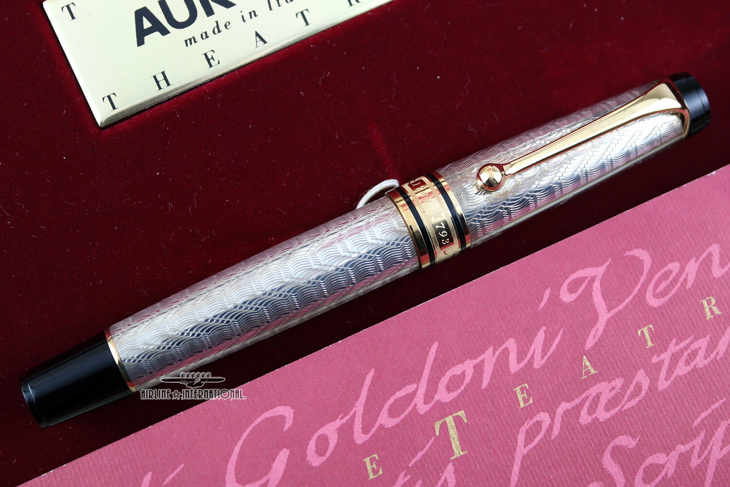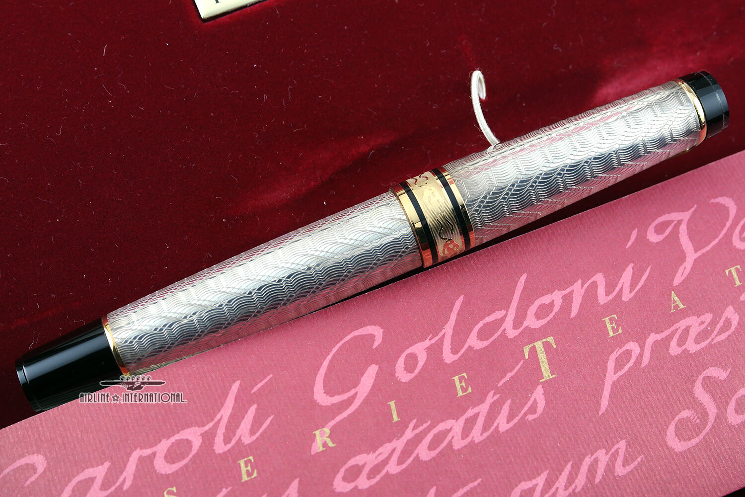 This fountain pen is a tribute to Carlo Goldoni's creative force: precious like his literary style, exclusive like his genius talent, classical like his theatrical masterpieces. Expert goldsmith and silversmith masters have created the guilloche "Venezia" and the central ring, where the masks from the "Commedia dell 'Arte" frame the commemoration date. The nib is in solid 18k gold, Extra Fine in size and the nib holder in ebonite.