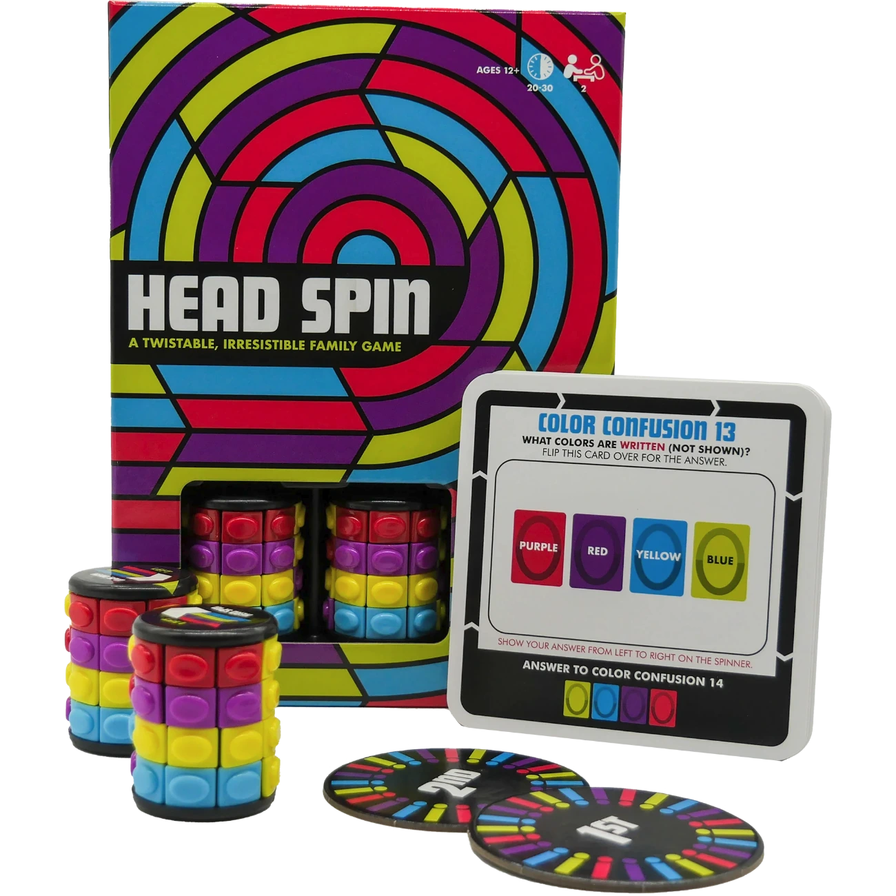 Head Spin is a fast-paced game where fidgety fingers race against mastermind. In each round, players will try to figure out the color order based on the prompt. Then they'll show that answer on their spinner and place it on the landing pad. The first player to show the correct answer on their spinner wins the round.