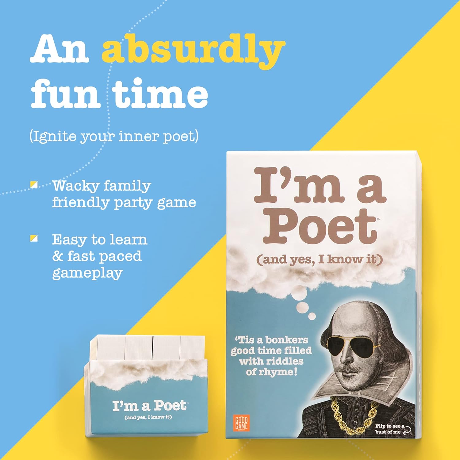 - 𝐏𝐞𝐫𝐟𝐞𝐜𝐭 𝐆𝐢𝐟𝐭 𝐟𝐨𝐫 𝐀𝐧𝐲 𝐎𝐜𝐜𝐚𝐬𝐢𝐨𝐧: Celebrate any occasion with the ideal gift of I'm a Poet. Whether it's a birthday, holiday, or special celebration, share the joy and excitement of this party game with loved ones. Create lasting memories, laughter, and bonding moments as you embark on poetic adventures together.