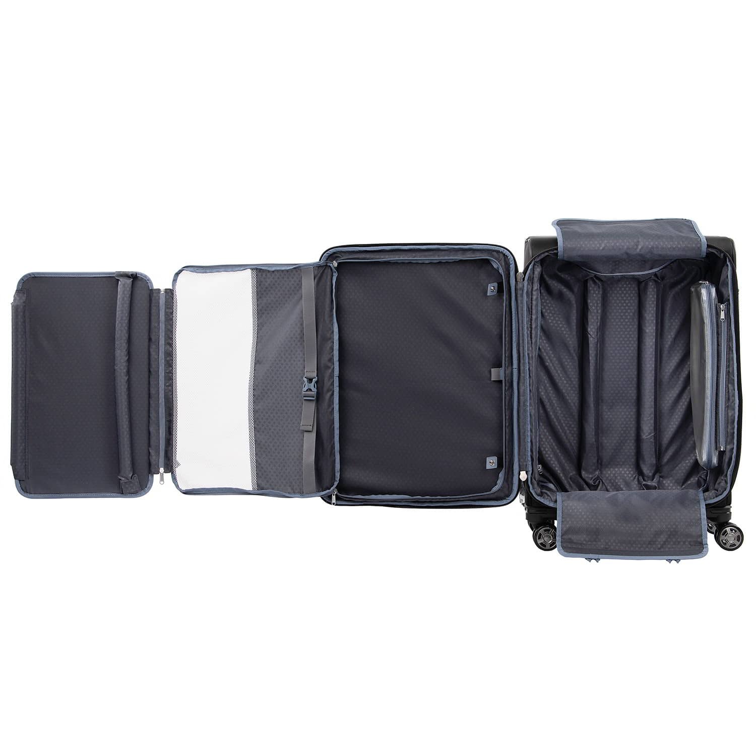 Interior view of the suitcase with the front panel's pocket unzipped and unfolded.