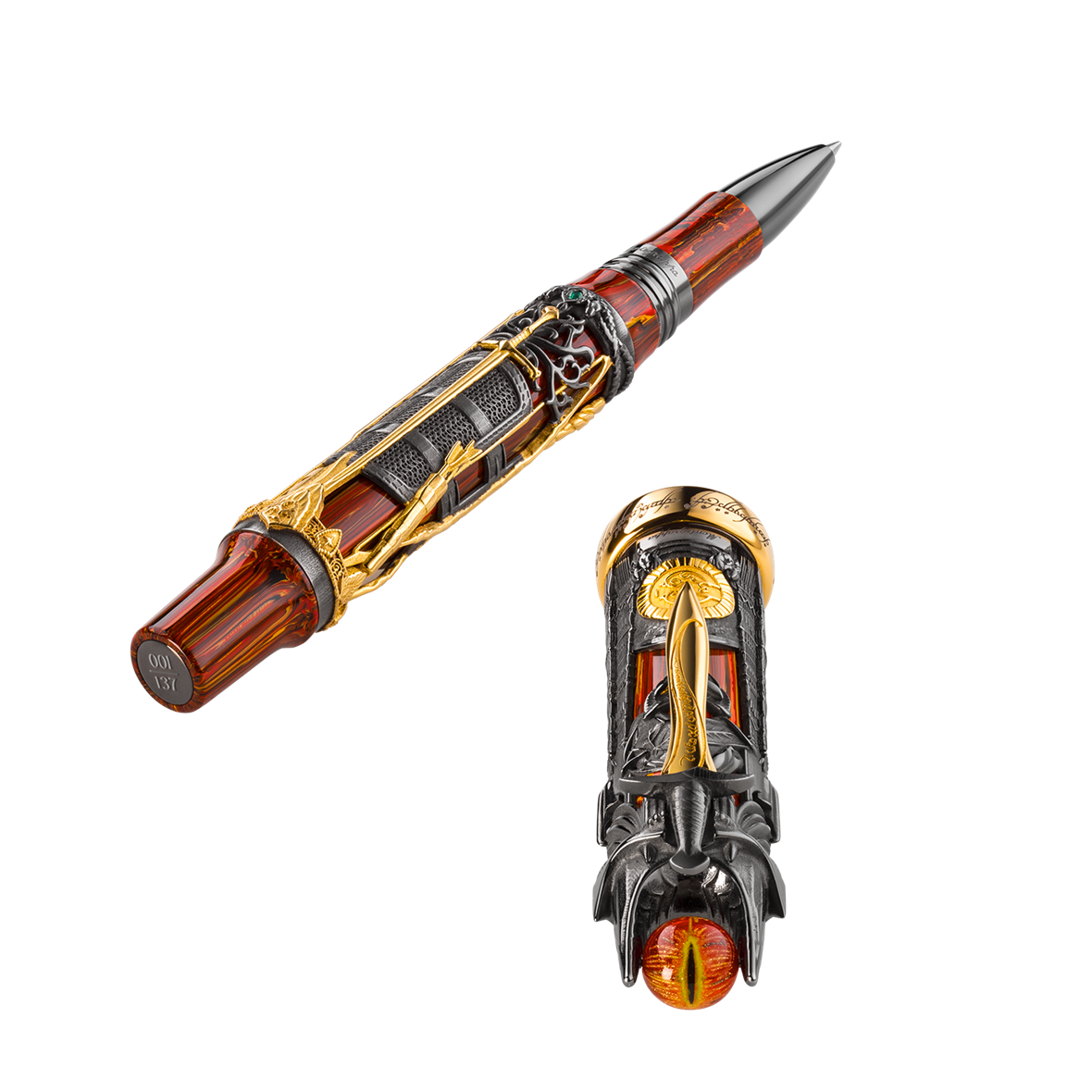 - Standout design features include a hand-enamelled ‘Eye of Sauron’ suspended in the Tower of Barad-dûr. The pocket-clip design reprises Sting – the Elvish dagger carried by Frodo Baggins – with a vermeil blade. A green cubic zirconia references Aragon’s Ring of Barahir, but is overshadowed by a replica of the One Ring itself. Able to be removed and worn, the Ruling Ring’s inclusion symbolises the power of writing and the timelessness of high artisanship.