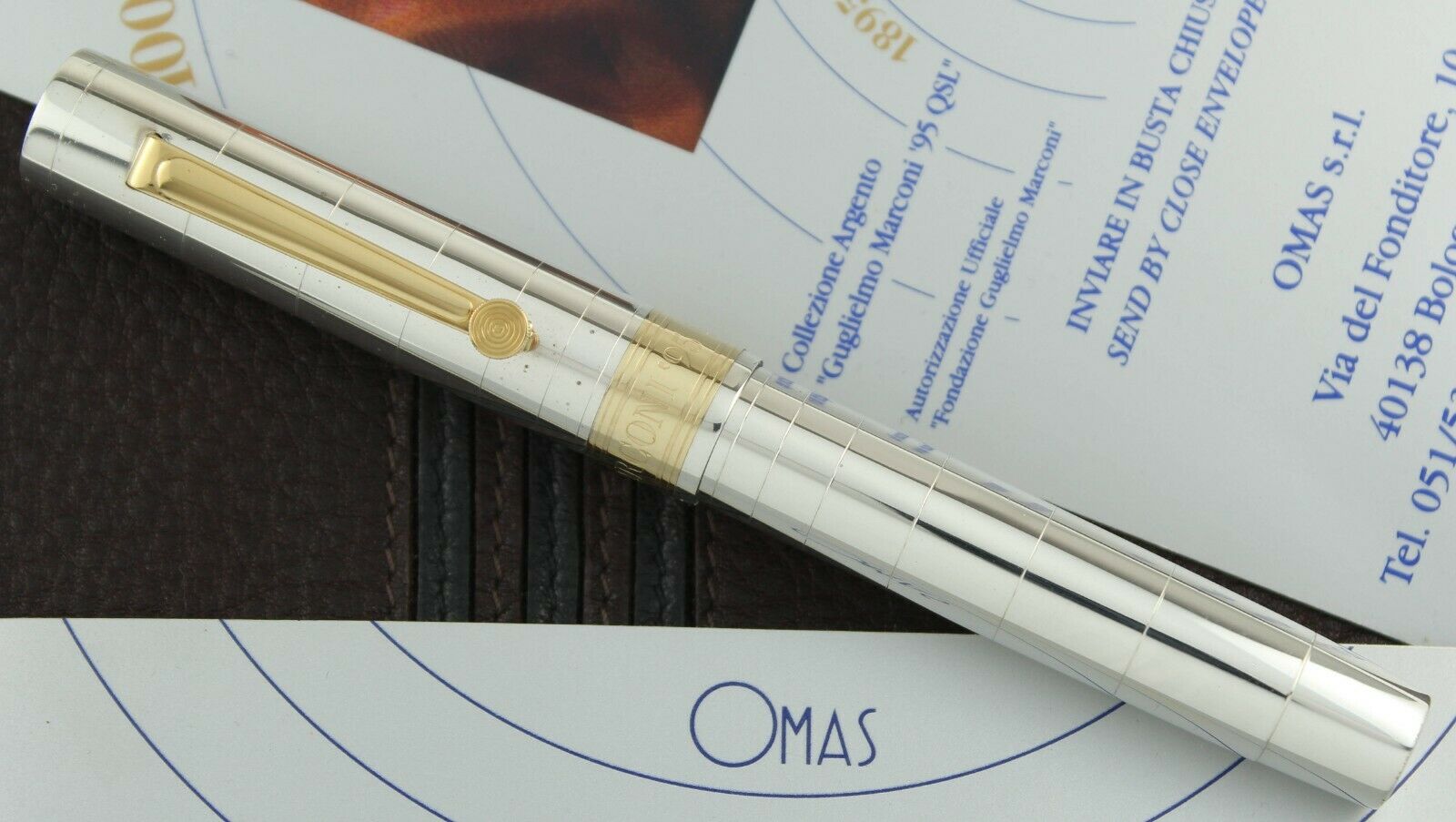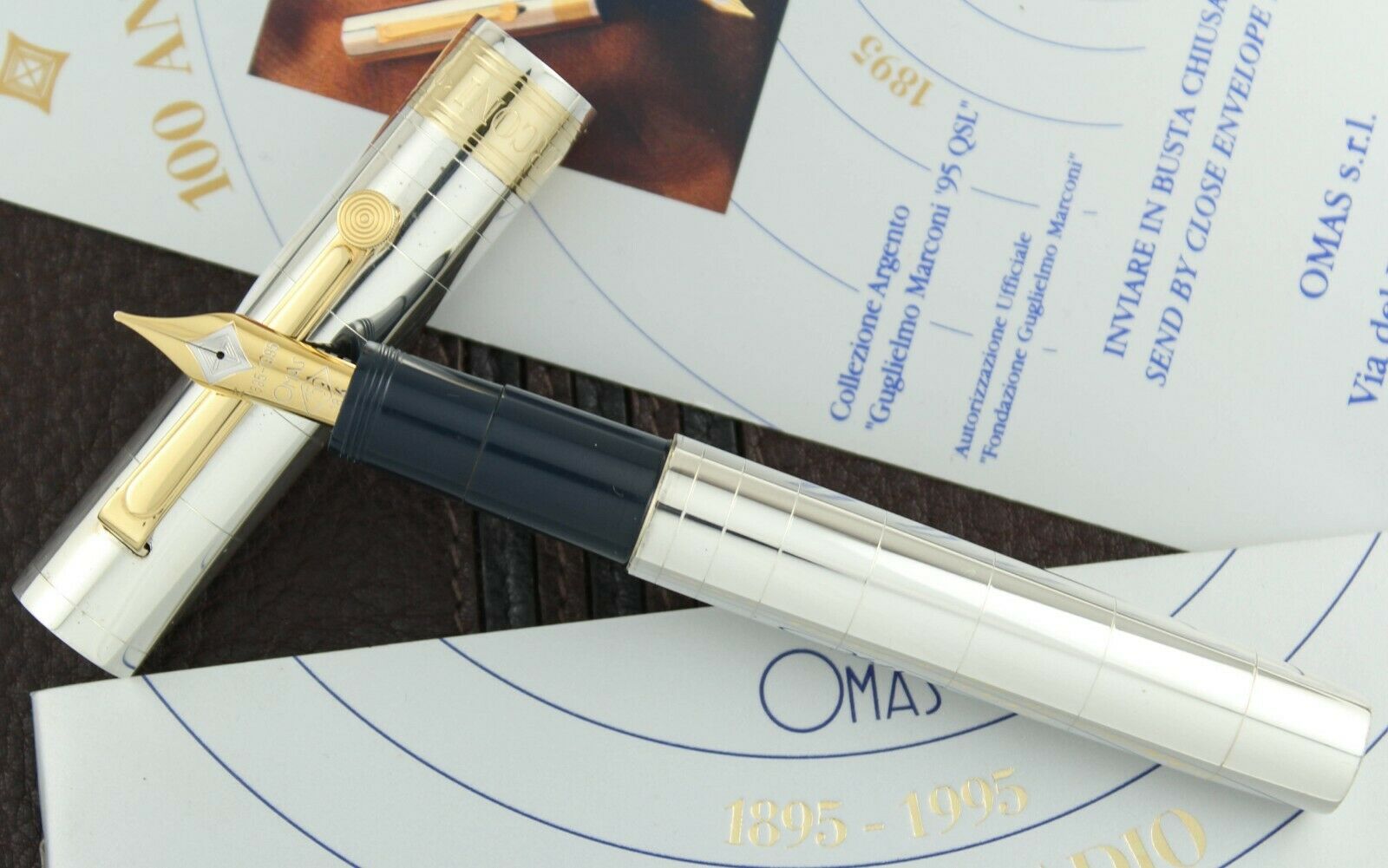 Omas celebrates Guglielmo's life and inventions with this magnificent creation. The pen features a dark blue resin with a solid silver overlay and gold-plated clip and cap ring. The clip symbolizes the "Straight Key" knob used in Morse code.