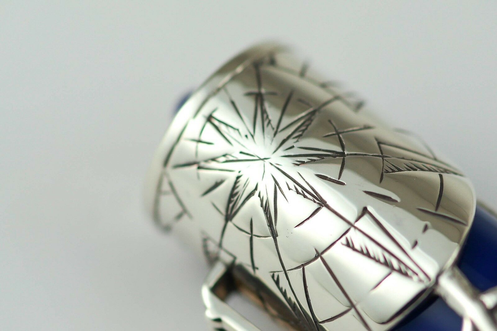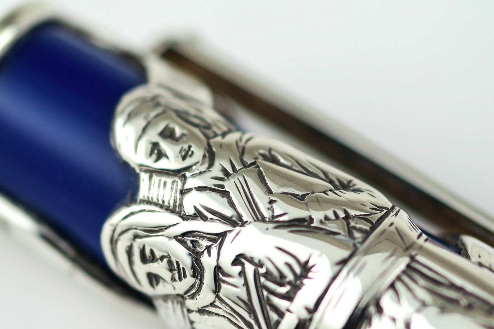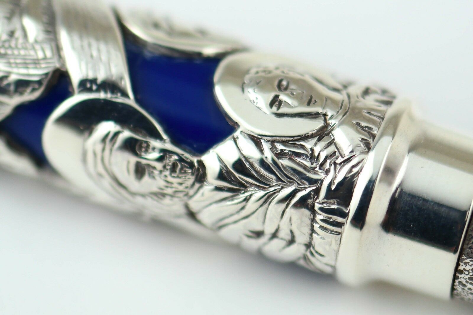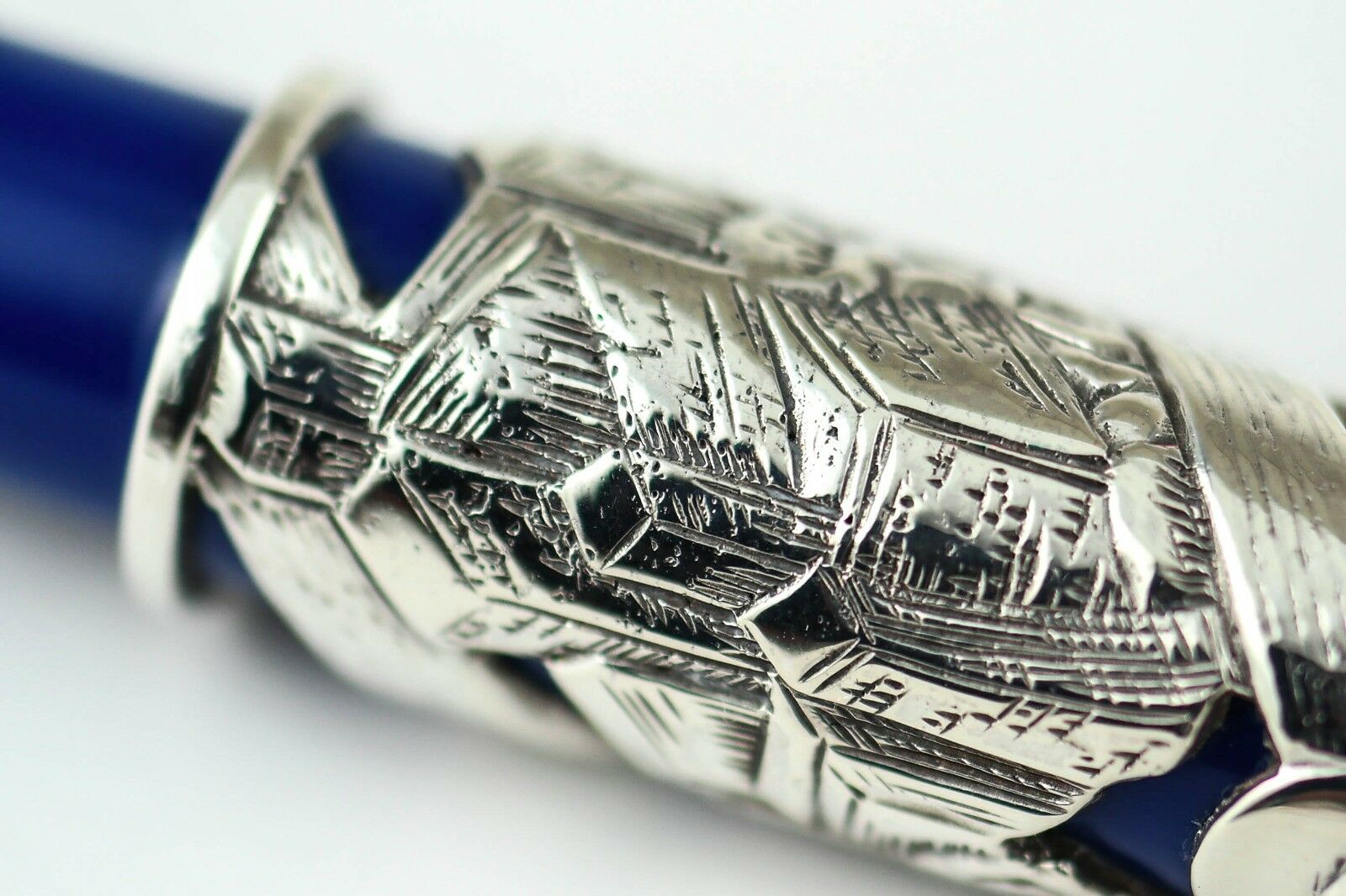 Each writing instruments features the same clip which symbolizes the third millennium and is produced from a rich blue vegetable resin with a sterling silver overlay.