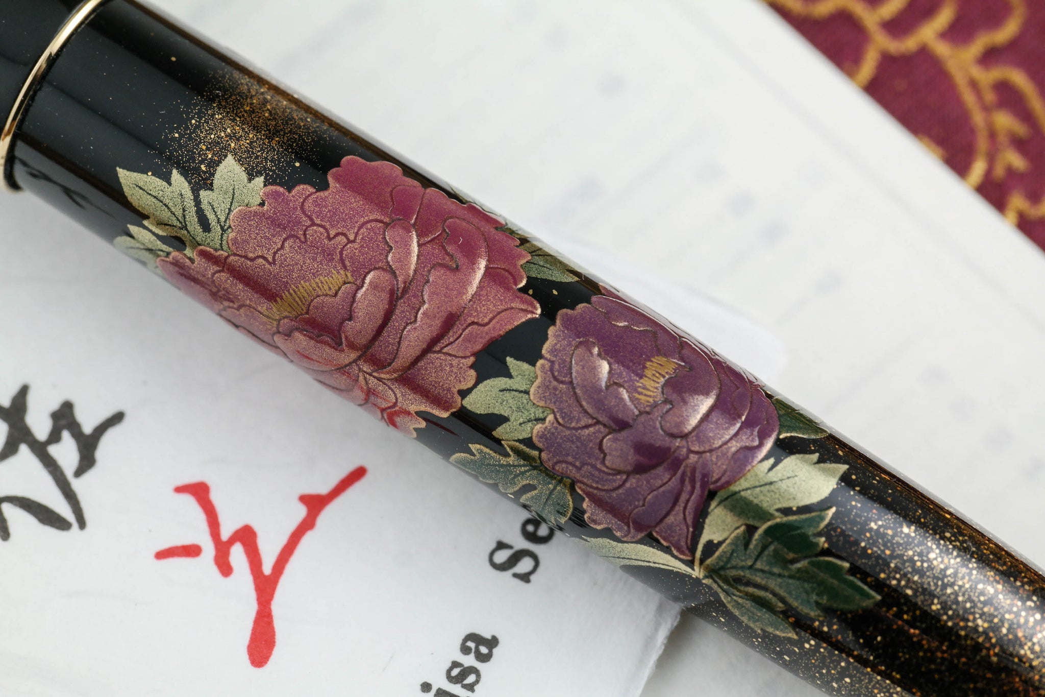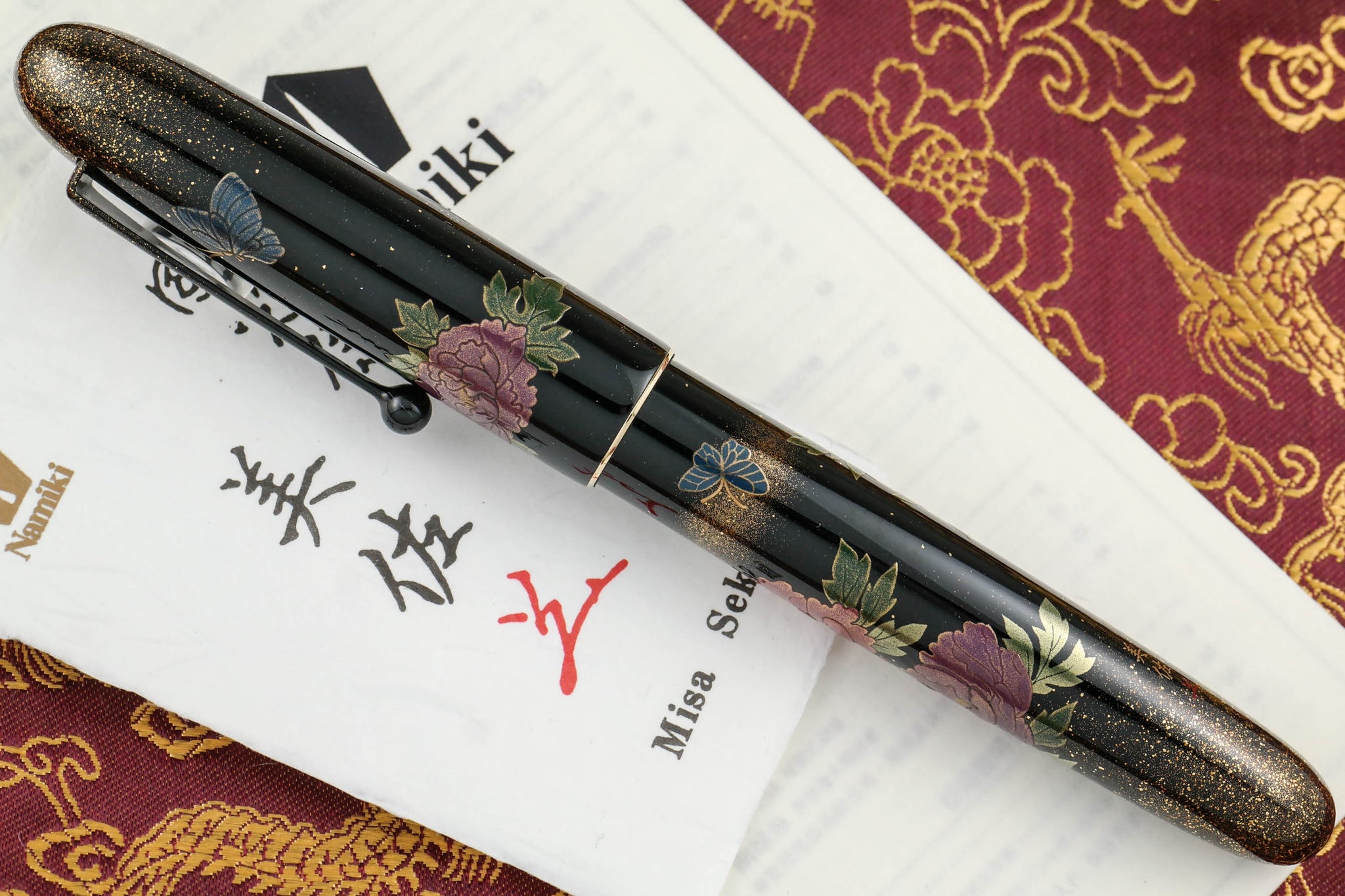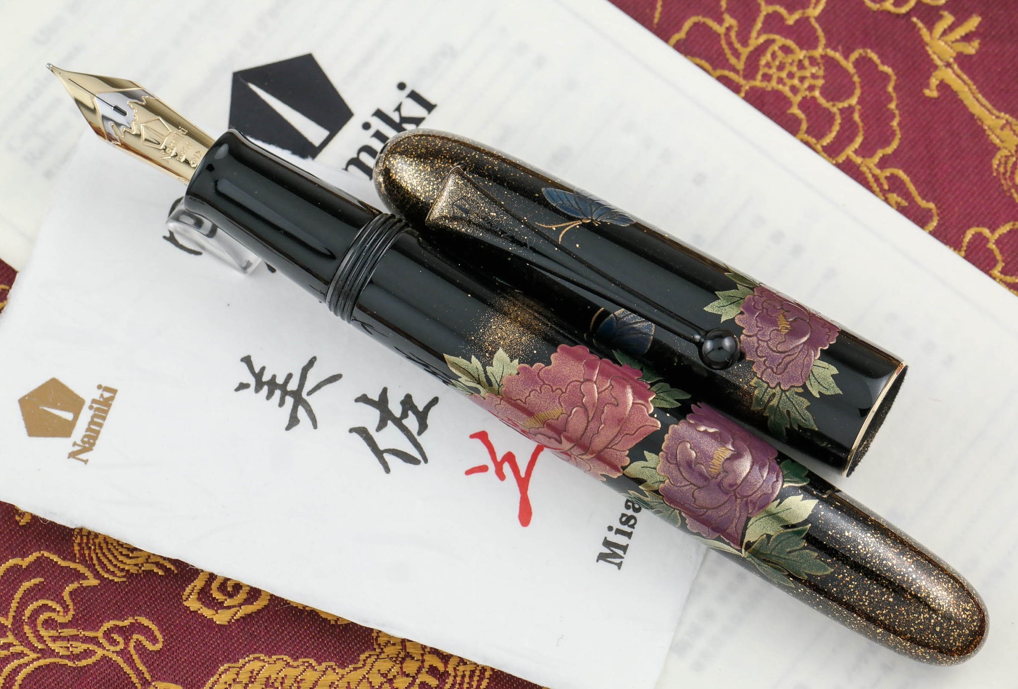 This Yukari Royale fountain pen features the taka maki-e technique for both peonies’ blooms and leaves. Dancing around the peonies are beautiful, royal blue butterflies with raden (iridescent, multifaceted Mother-of-Pearl, which makes each pen unique) specially inlaid in the wings. Butterflies are naturally drawn to these flowers. Both the flowers and the butterflies showcased are expressed through togidashi-taka maki-e techniques (burnished-raised design applying a layer of lacquer, sprinkling gold or silver powder, and drying with an additional lacquer layer to fix the powder). The background is the traditional black lacquer accentuated with gold powder.
