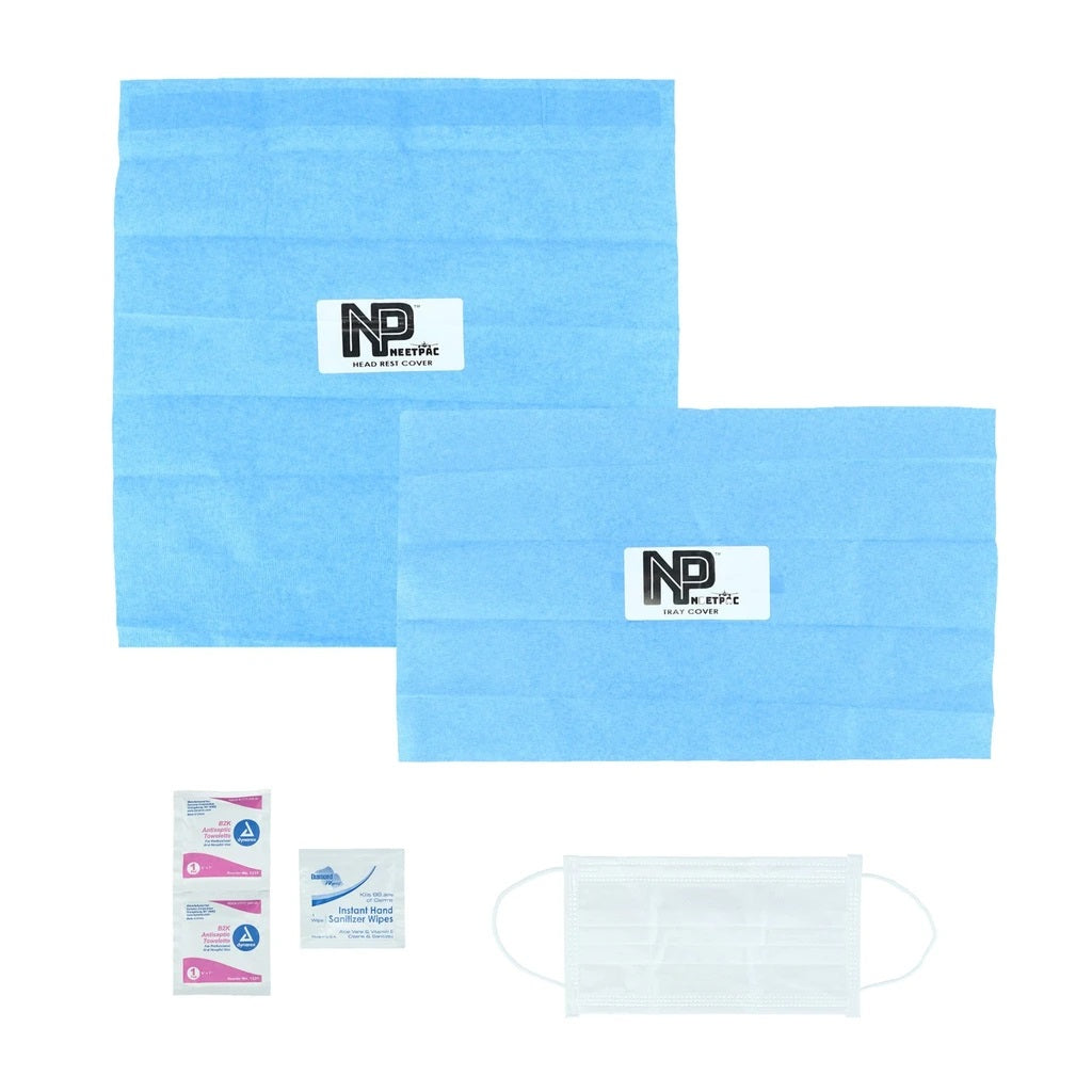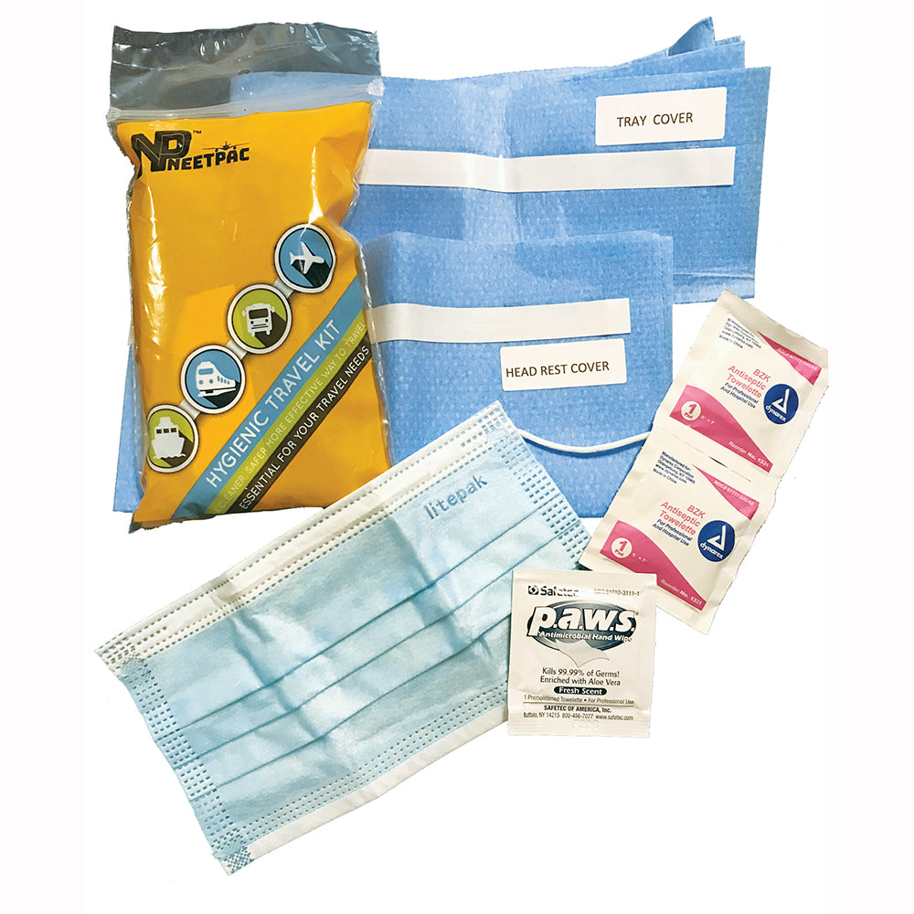 Includes head-cushion cover, tray table cover, face mask, 1 hand sanitizer wipe and 2 disinfectant wipes.