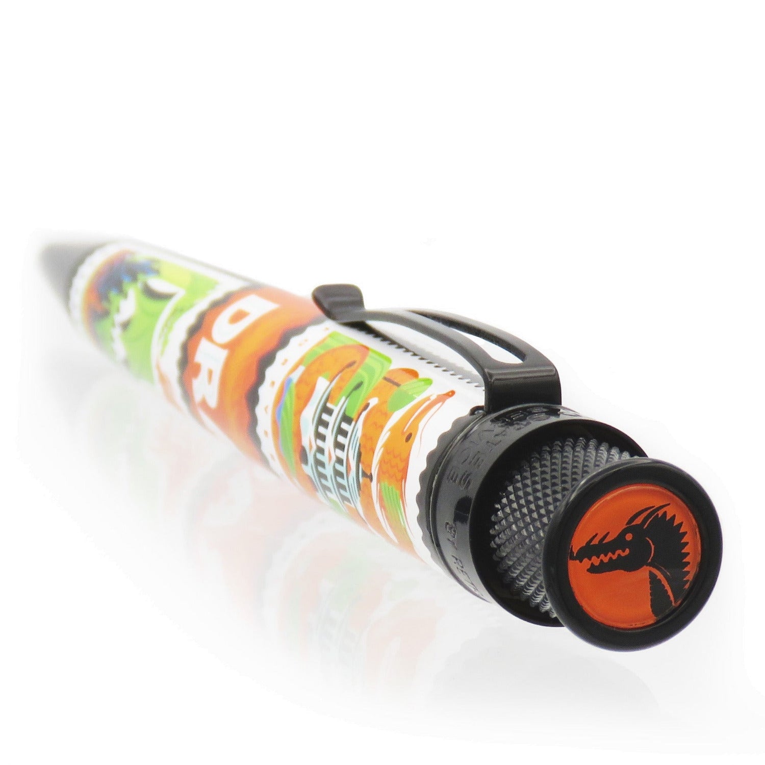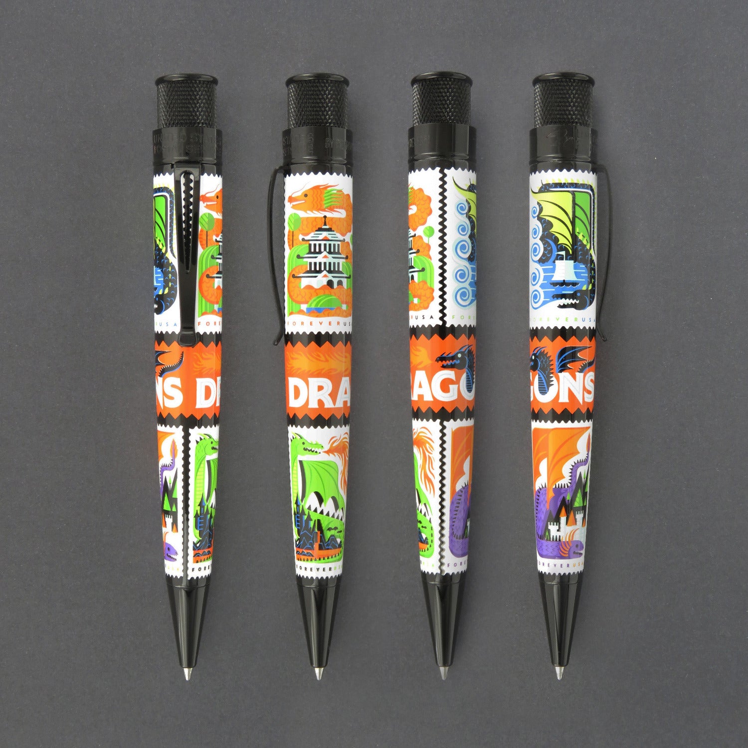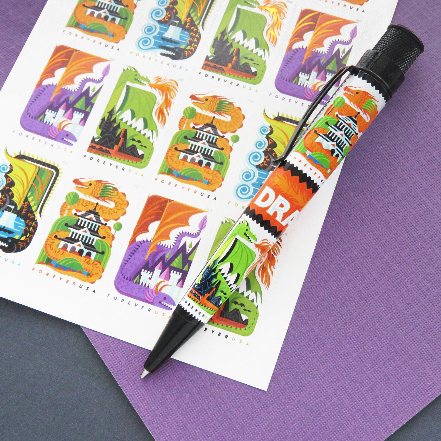 Take a journey back to legendary times with the newest United States Postal Service® licensed design, Dragons! This Retro51 Big Shot showcases four dragon designs illustrated by artist Don Clark of Invisible Creature. The Forever® stamp art has now been turned into a rollerball pen featuring "the high-flying, fire-breathing mythological creatures that have roamed our imaginations for millennia."