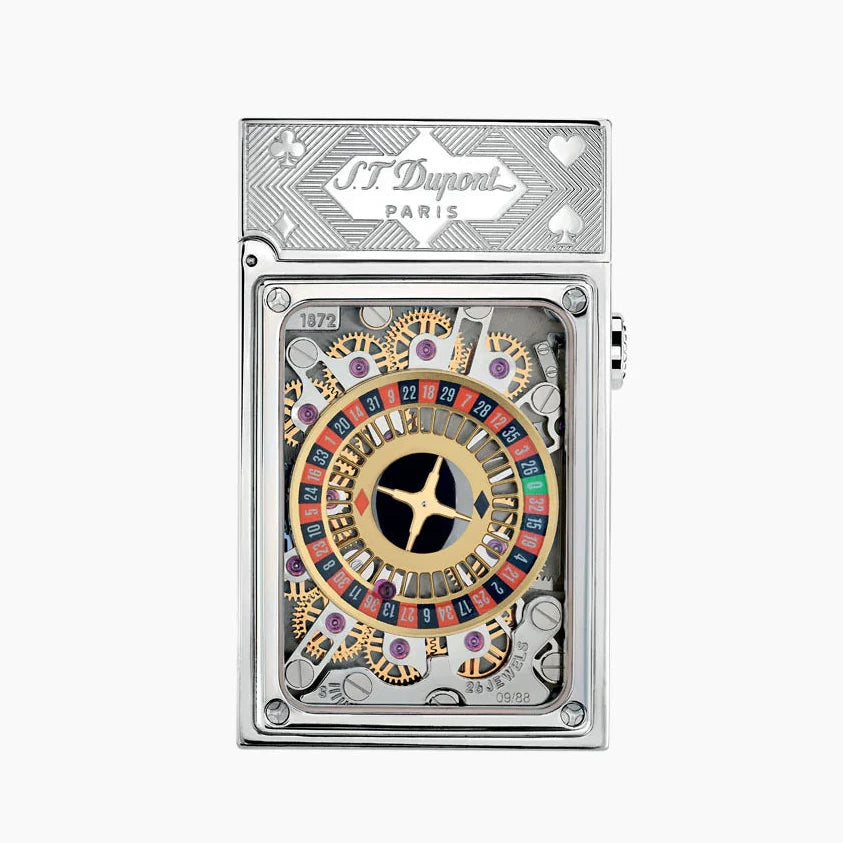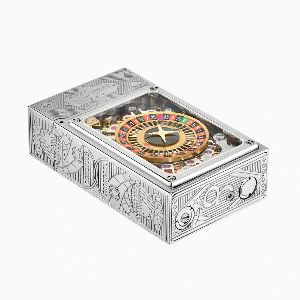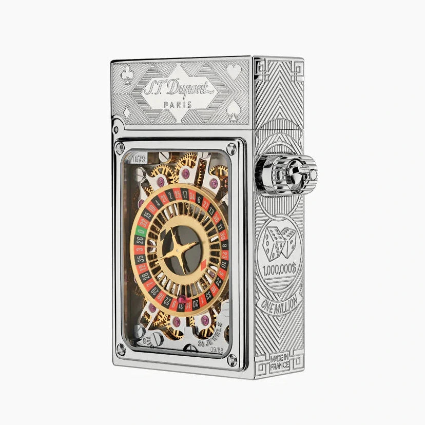 An exquisitely designed lighter that features a precise horology mechanism and fine jewelry details. With its shiny palladium finished brass and delicate micro-mechanism, 26 clock-work rubies are integrated to ensure the best performance.
