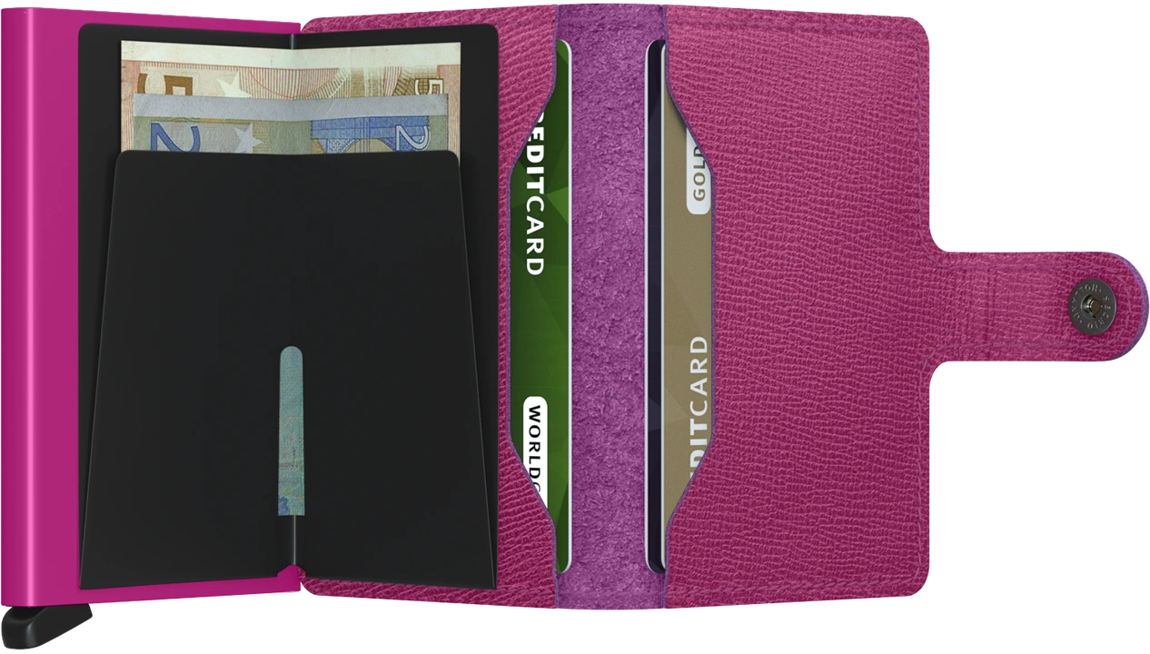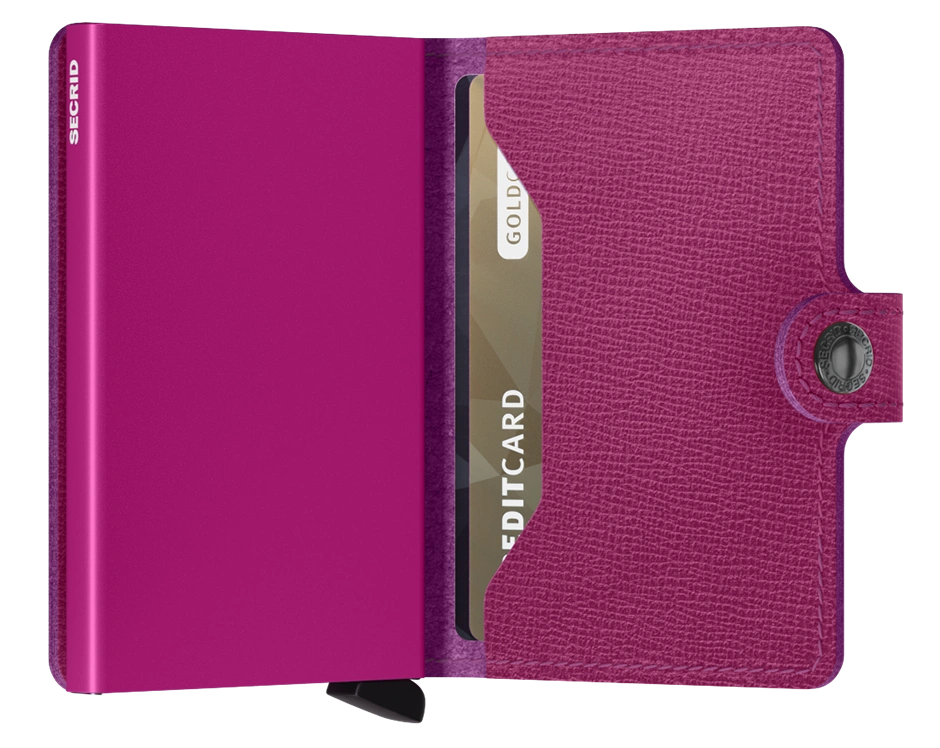 Interior view of the fuchsia mini wallet. The aluminum card case is a matching color.