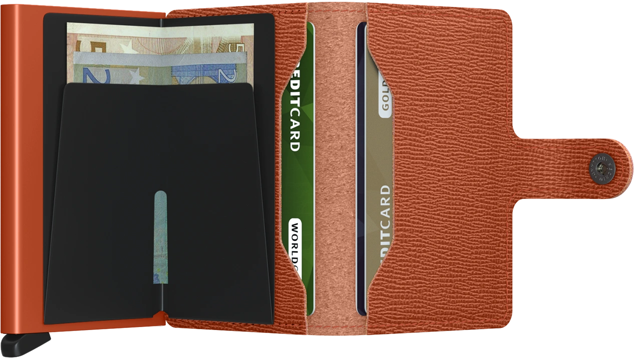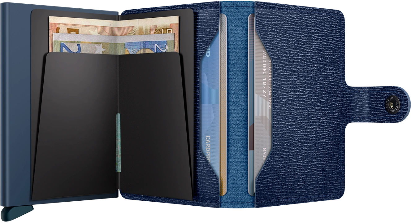 Small in size and surprisingly large in storage capacity, the Mini wallet combines the best of both worlds. The exterior holds banknotes, receipt and cards, while the aluminum Card protector allows you to slide out cards with one simple motion and protects them from bending, breaking and unwanted wireless communication.