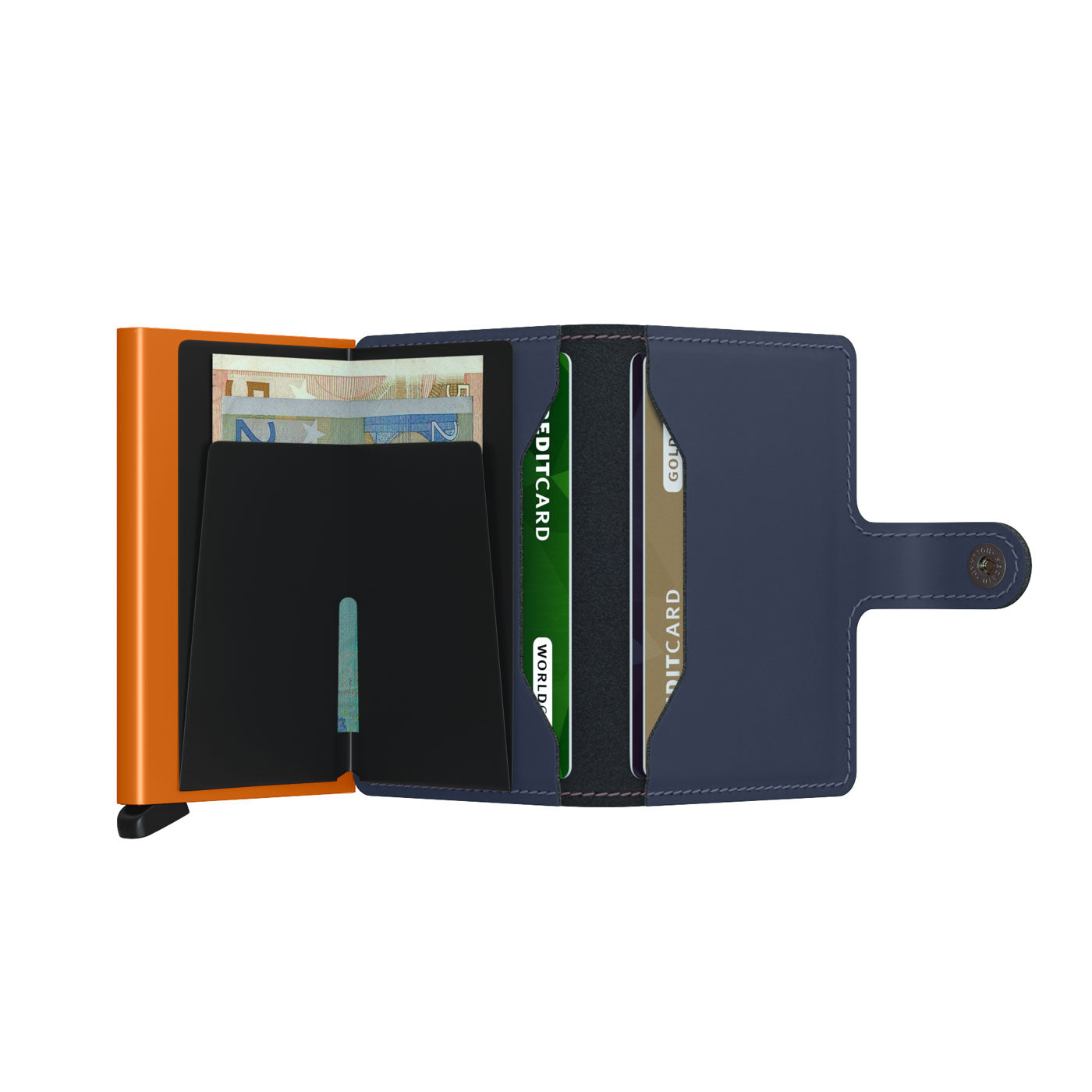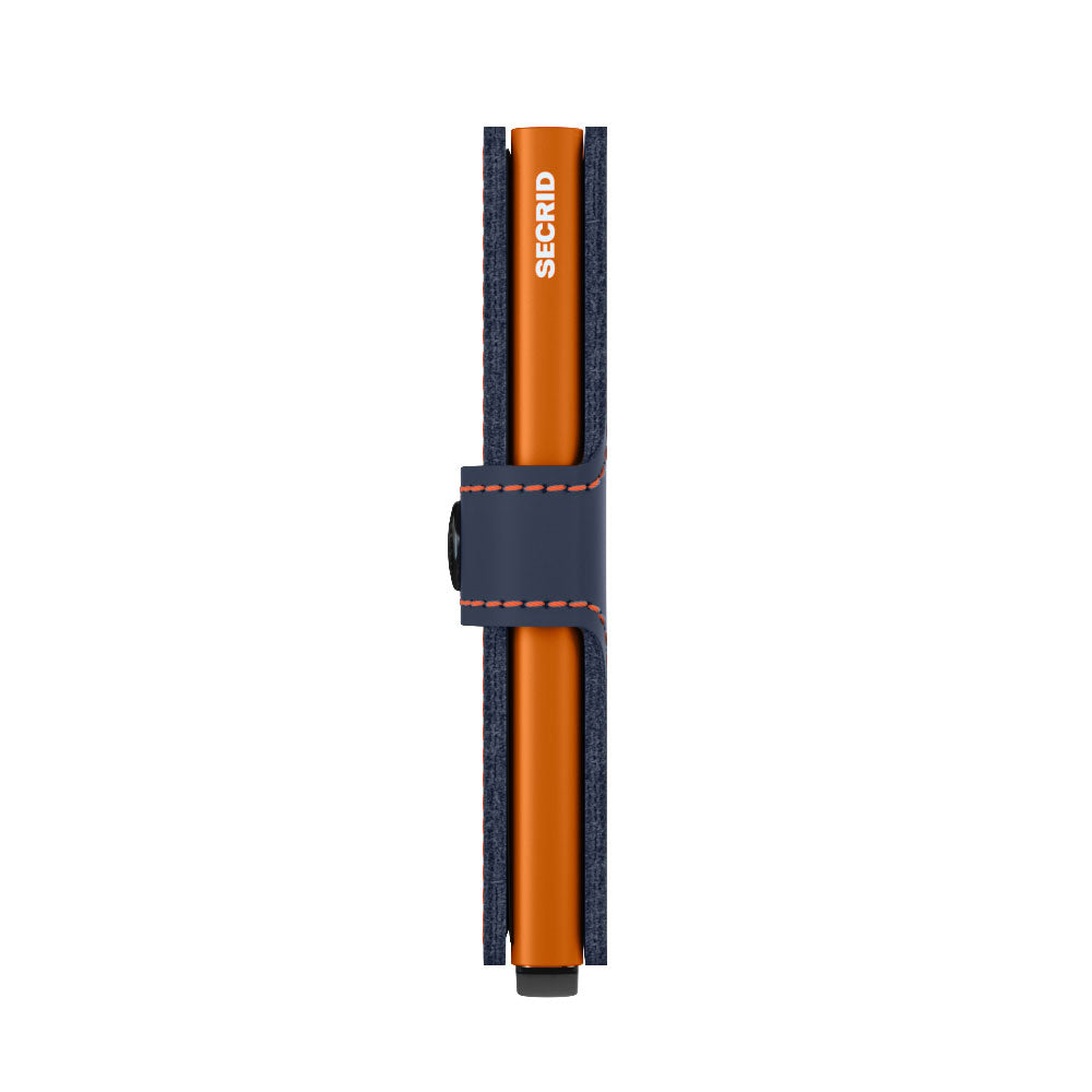 Angled front view of the blue and orange mini wallet.