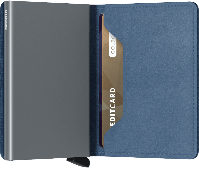Interior view of the ice blue slim wallet. The aluminum card case is gray.