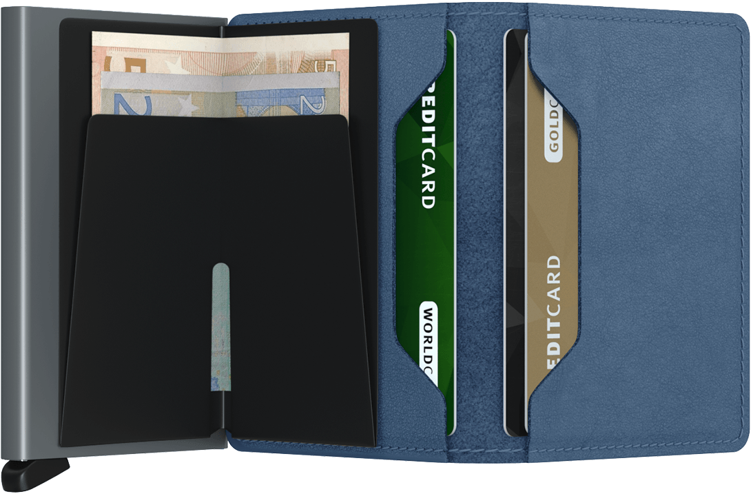 Its slim profile makes the slim wallet fit perfectly into every pocket. The open exterior is cut extra wide to hold cards, banknotes and receipts. The Card protector mechanism allows you to slide out cards with one simple motion, while the aluminum protects your cards from bending, breaking and unwanted wireless communication.