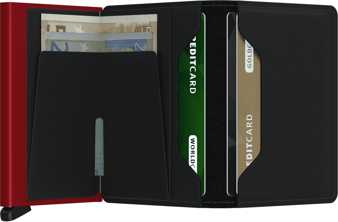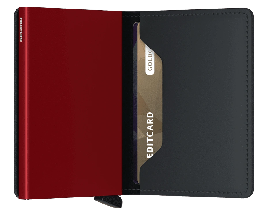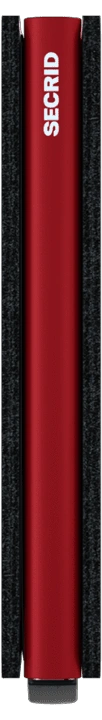 A slim matte black and red card wallet with the brand name 'secrid' visible on the side.