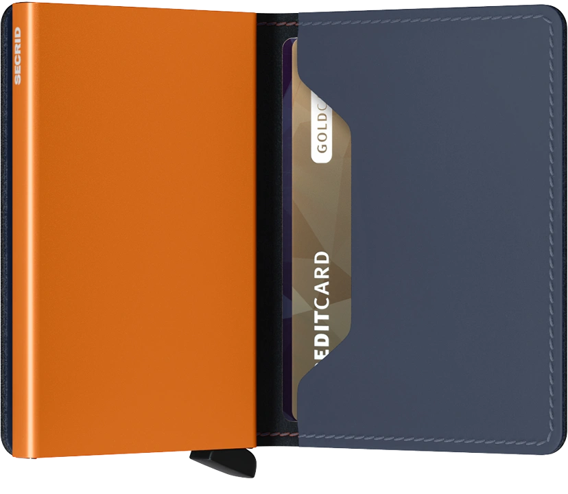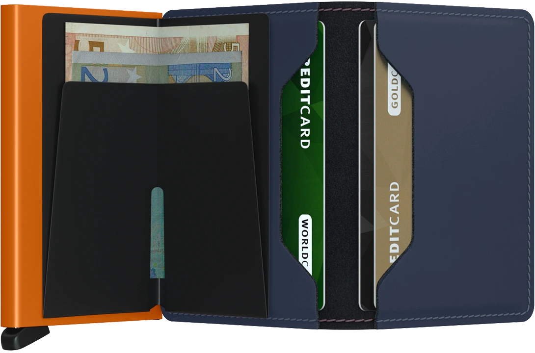 Its slim profile makes the slim wallet fit perfectly into every pocket. The open exterior is cut extra wide to hold cards, banknotes and receipts. The Card protector mechanism allows you to slide out cards with one simple motion, while the aluminum protects your cards from bending, breaking and unwanted wireless communication.
