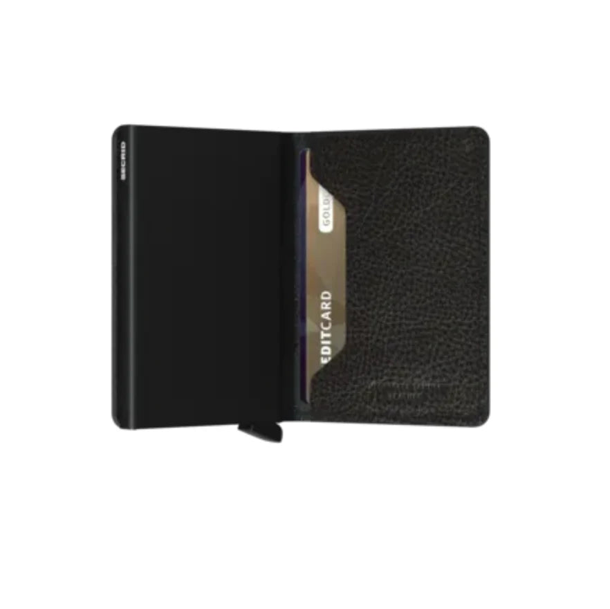 Its slim profile makes the slim wallet fit perfectly into every pocket. The open exterior is cut extra wide to hold cards, banknotes and receipts. The Card protector mechanism allows you to slide out cards with one simple motion, while the aluminum protects your cards from bending, breaking and unwanted wireless communication.