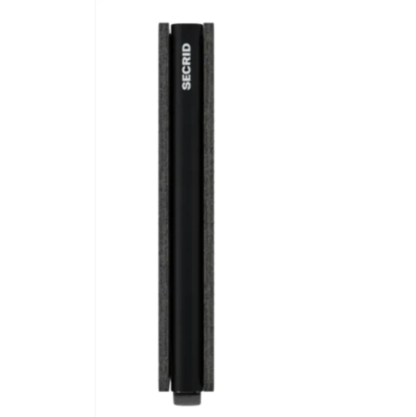 Interior view of the black slim wallet. The back of the aluminum card case features a money clip.
