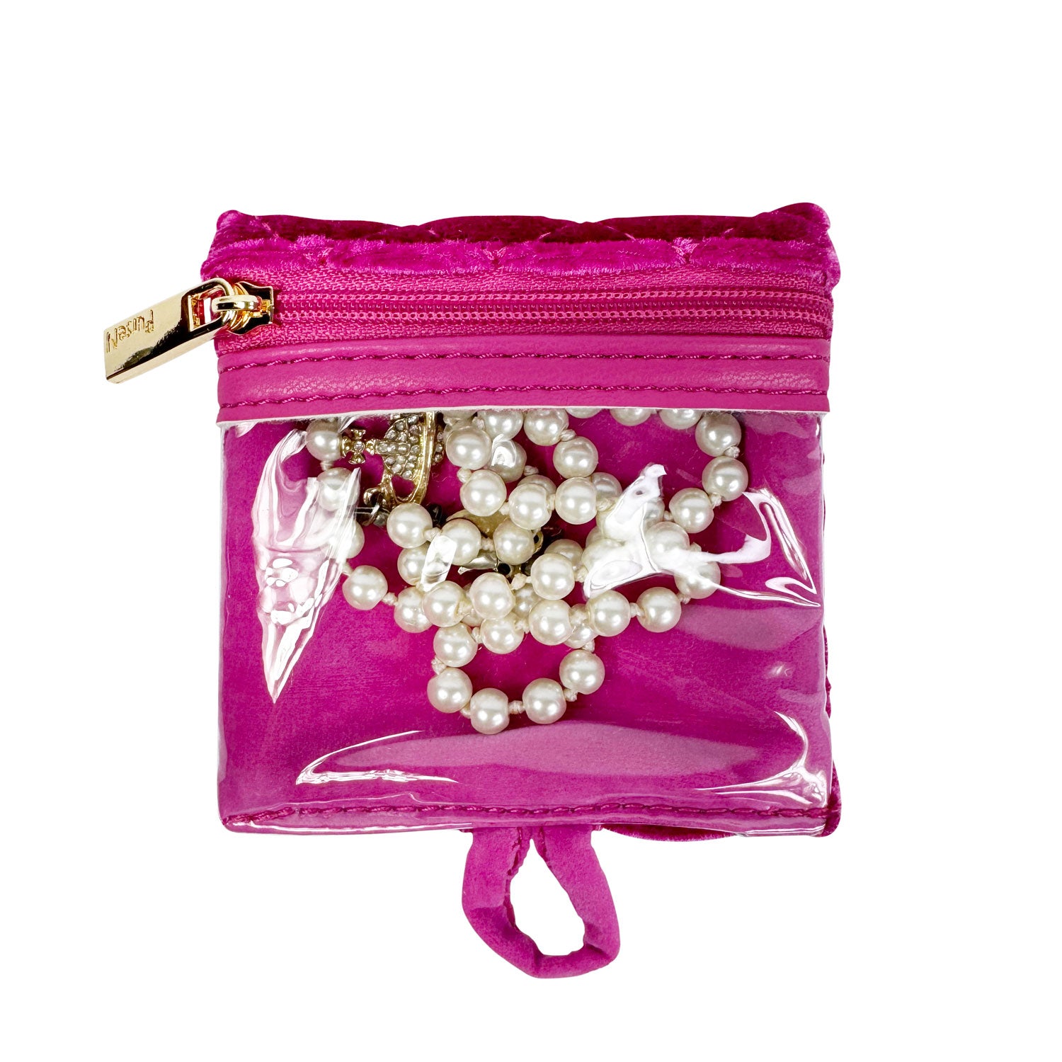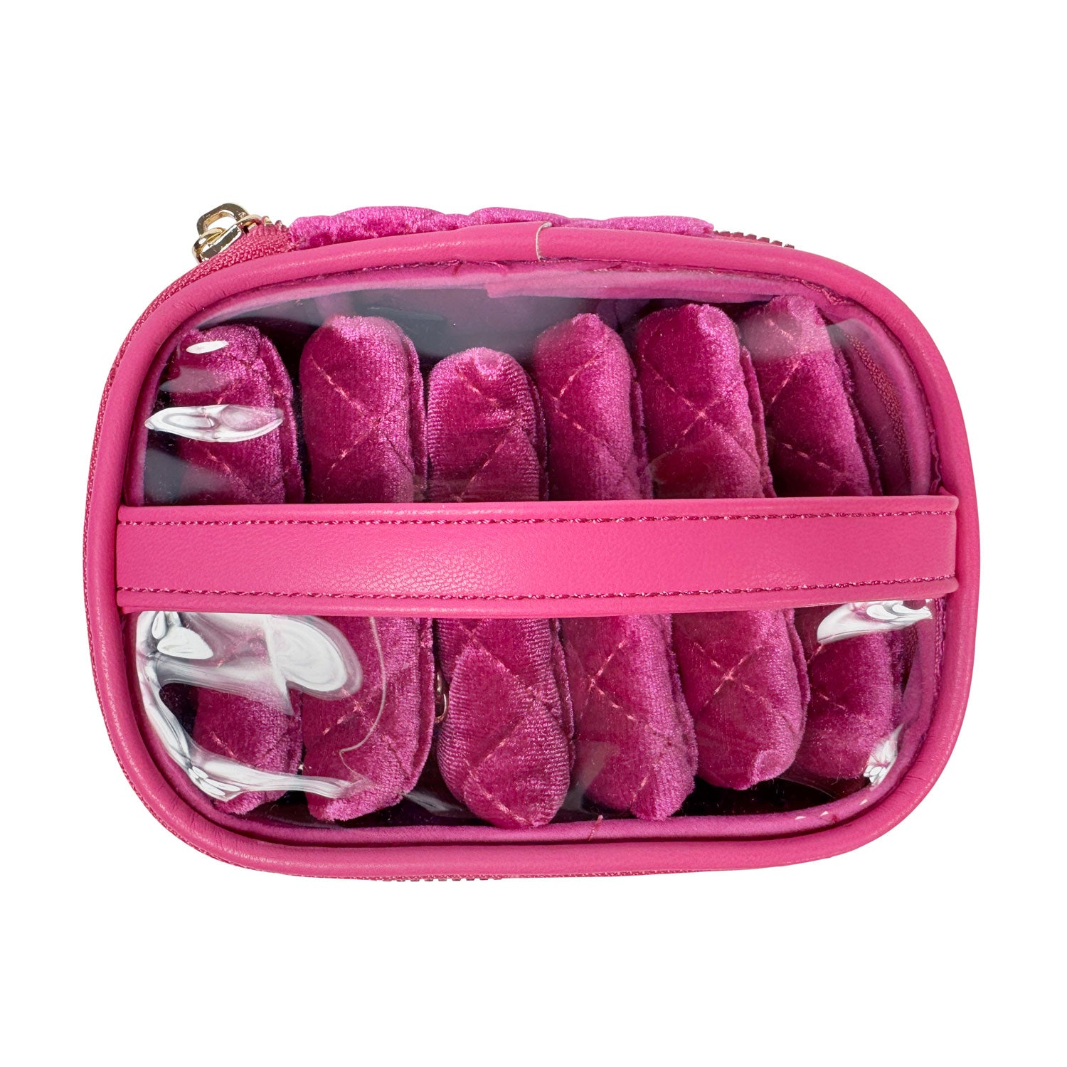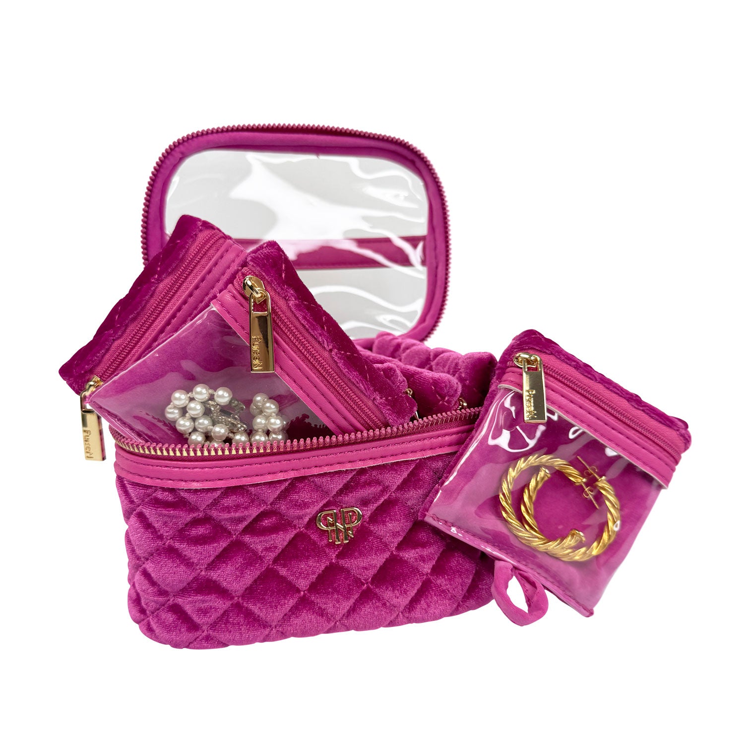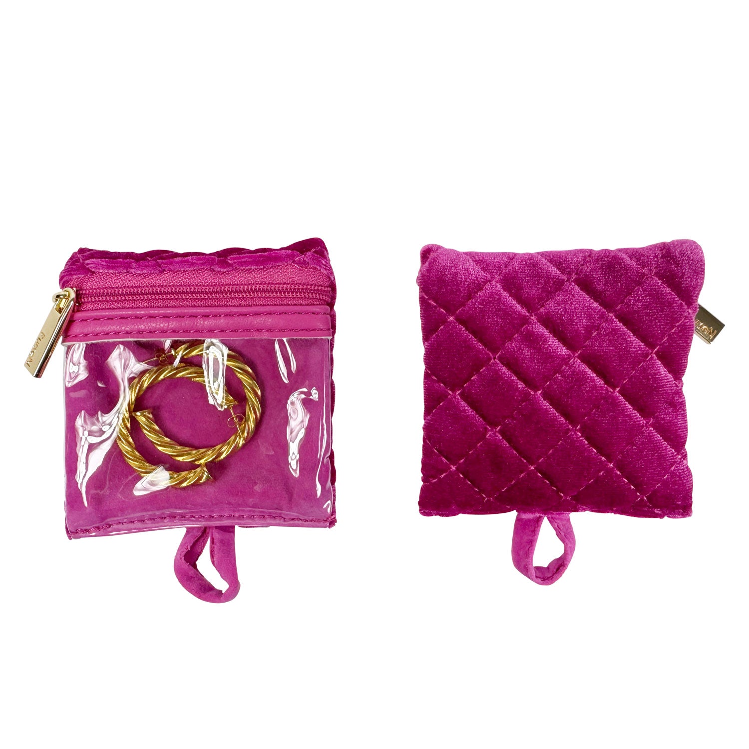 There is nothing more frustrating than misplacing one earring from a set you love. Our clear front removable pouches in our Fuchsia Velvet Getaway Jewelry Case are the solution. Keep your earrings, rings, bracelets and more neatly organized and easy to see. It is the perfect travel case for keeping small to medium jewelry from getting lost or tangled at home or on-the-go. This is one of our customer favorites.