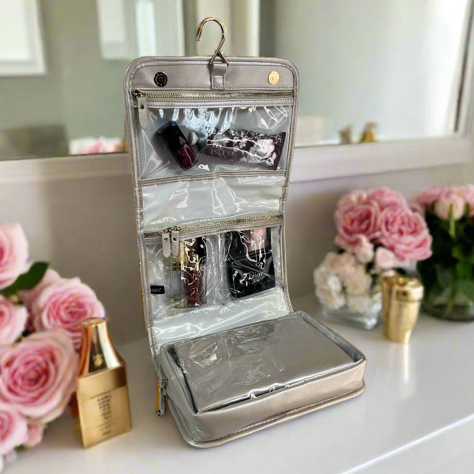 This buttery soft Vegan Leather Pearl Getaway Toiletry Case is a best seller. It is perfect for travel and keeps your toiletries secure and beautifully organized. Brides LOVE this case! With the top folding hanger, your items are easily visible and accessible, no matter where your travels take you. All pockets have a clear view design, allowing you to effortlessly admire your essentials without the need to unzip. Additionally, the bottom pocket includes a removable zipper pouch for added storage capacity.