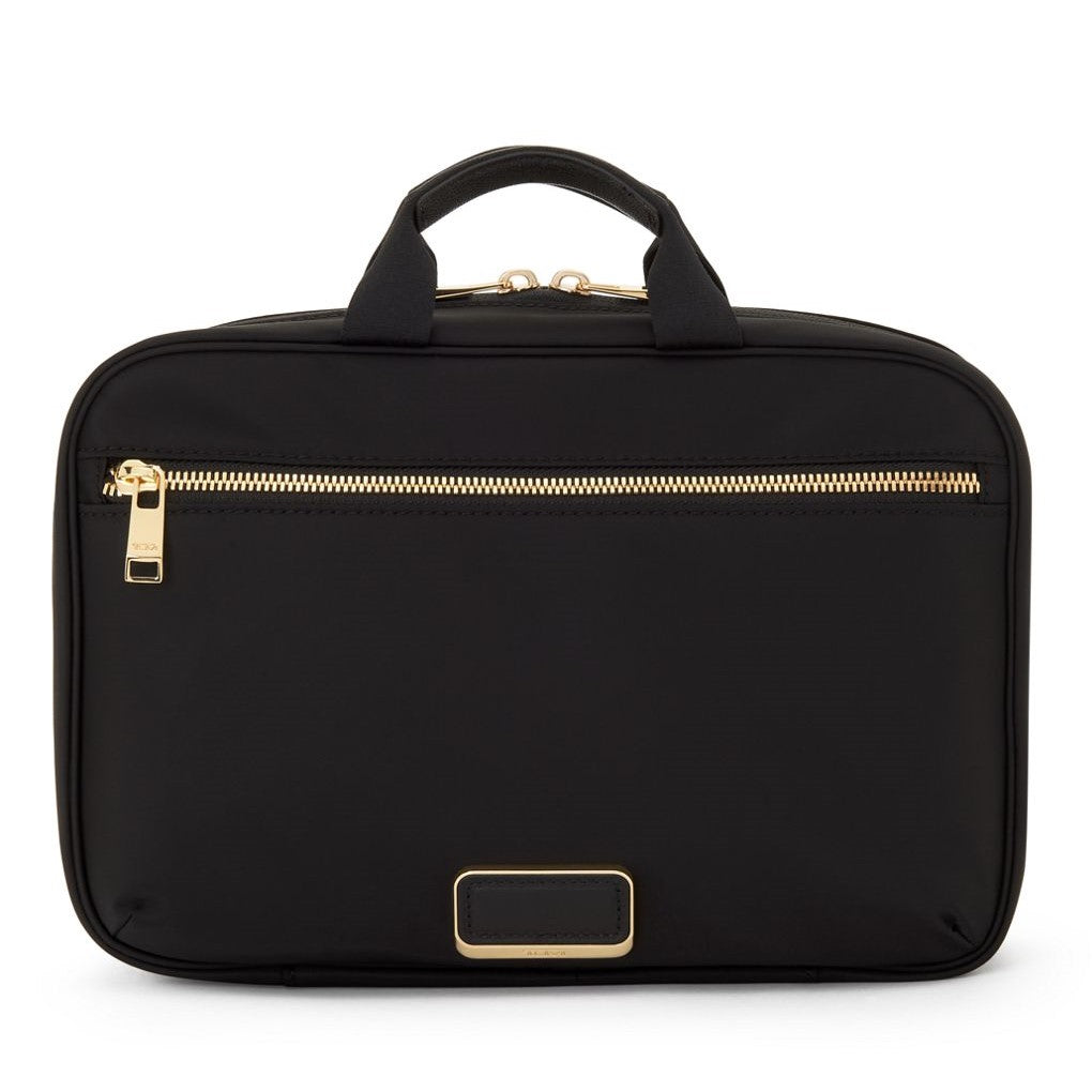 Don’t leave home without this travel-ready style. Three transparent interior compartments and a detachable pouch create optimal organization. Lay it flat or hang from a fixture when open.