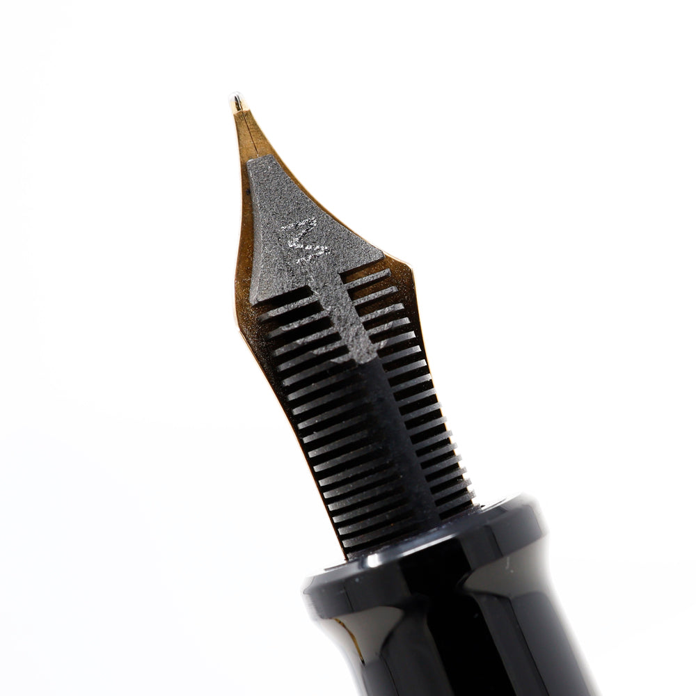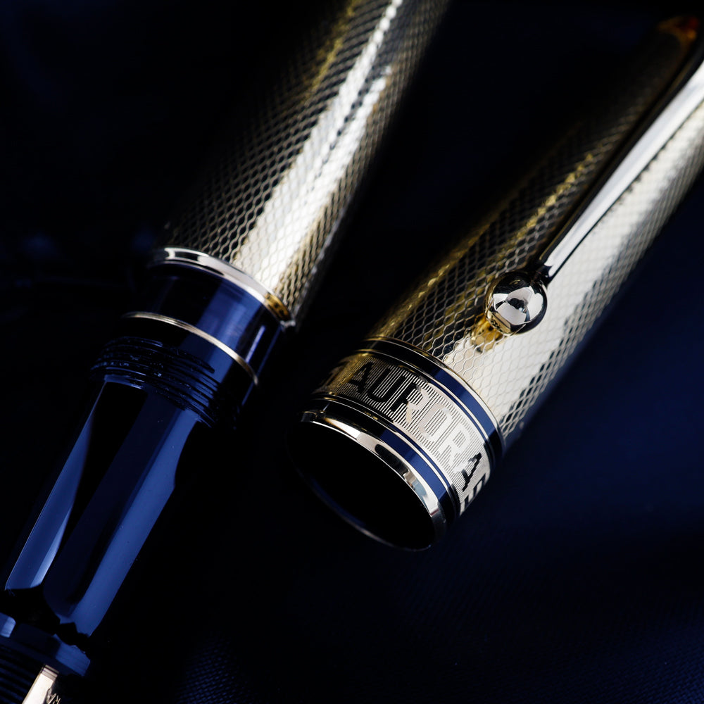 The Aurora Optima is fashioned in solid 18k gold with black resin accents. Both the cap and barrel are stamped '750' and feature beautiful guilloche engraved patterns. The writing instrument comes equipped with an 18k gold nib, medium.