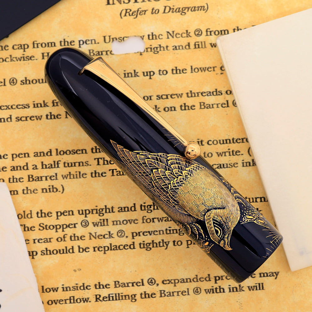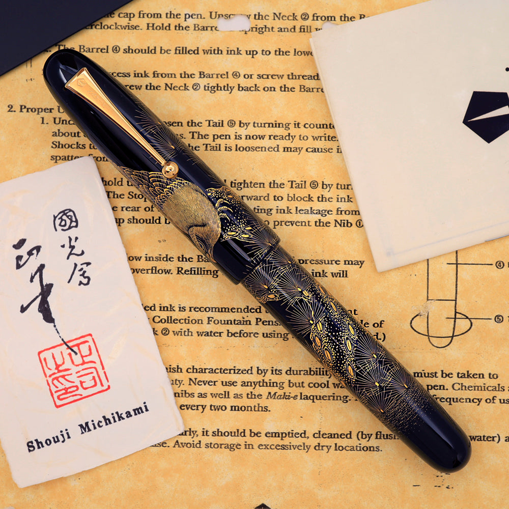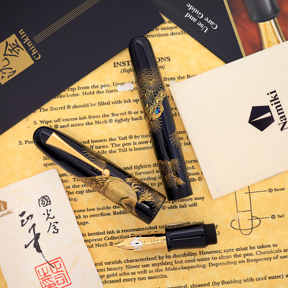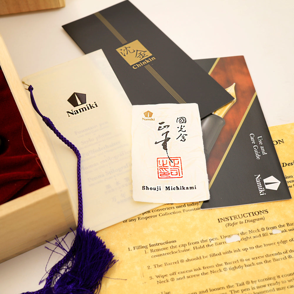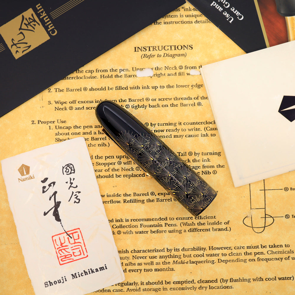 The Chinkin Collection is made up of fountain pens which use “Chinkin (Gold Inlay)”, one of lacquer ware techniques that Japan boasts to the world on a par with Maki-e. Motifs are carved into the lacquered surface with special chisels, and after inlaying lacquer in the grooves, placing gold leaves and gold powder gives the pattern expression.