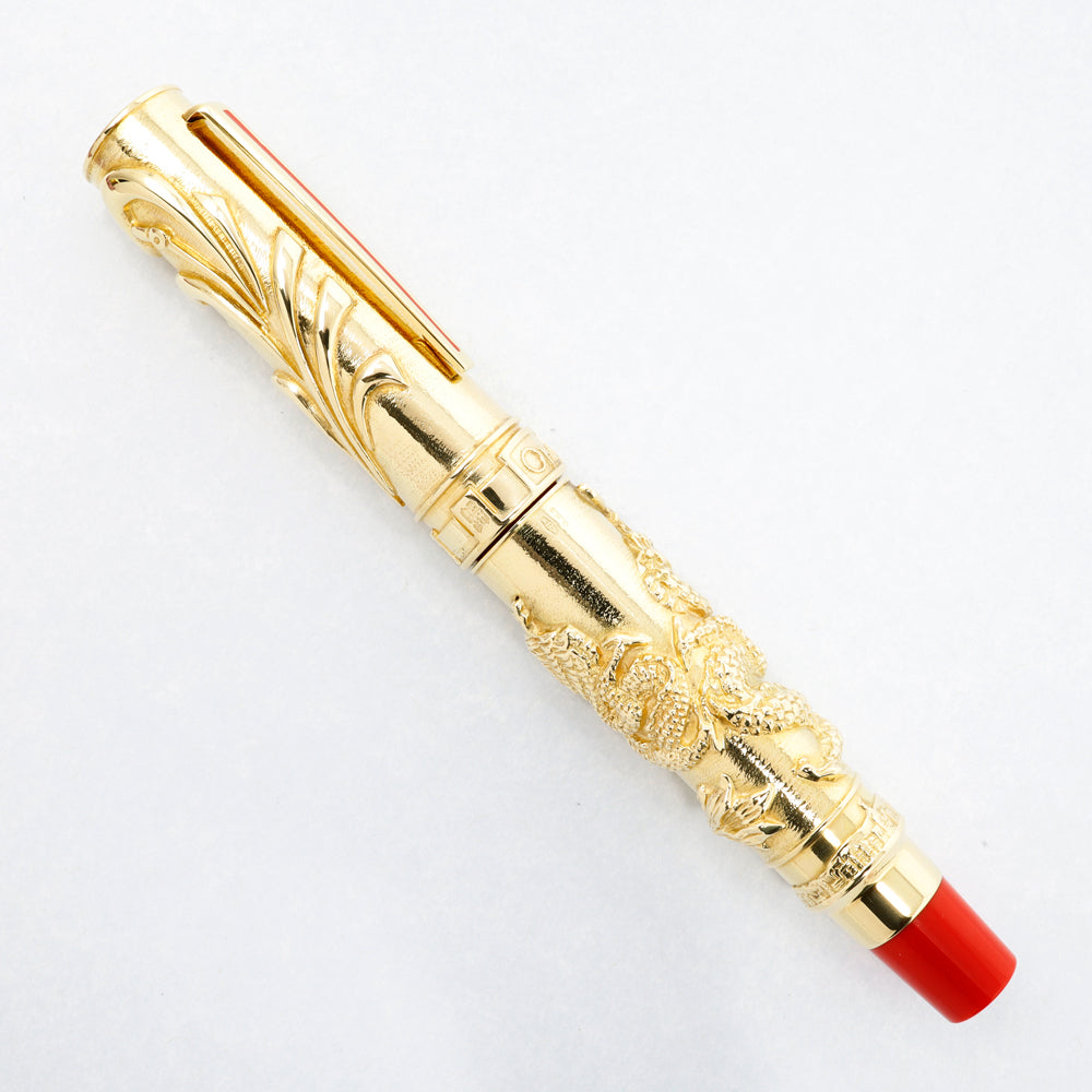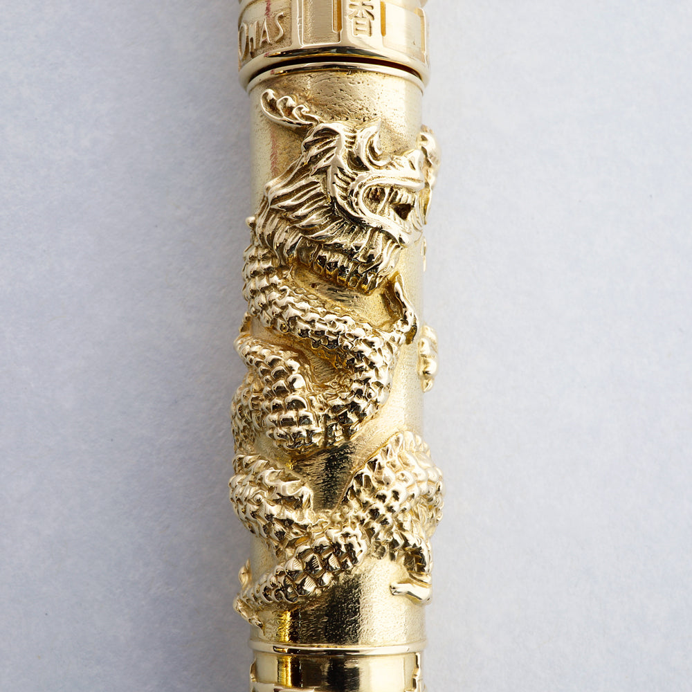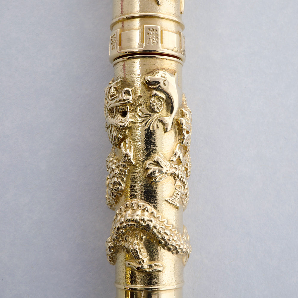 The barrel of the pen follows this theme of combining Hong Kong and Chinese motifs. Sculpted in to the metal sheath of the barrel, two Chinese dragons, mother and child, allude to the relationship between Hong Kong and China and support the emblem of their unity, the pink Chinese dolphin.