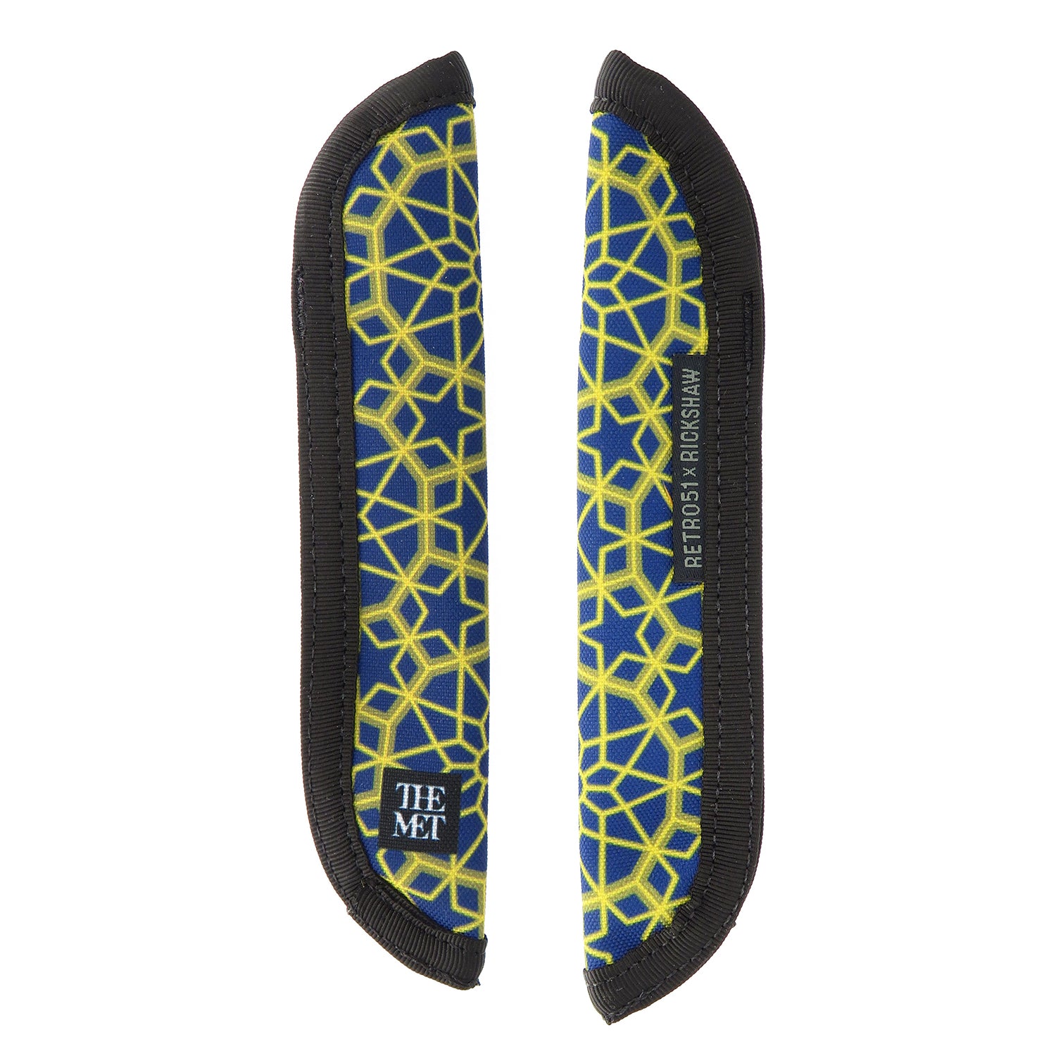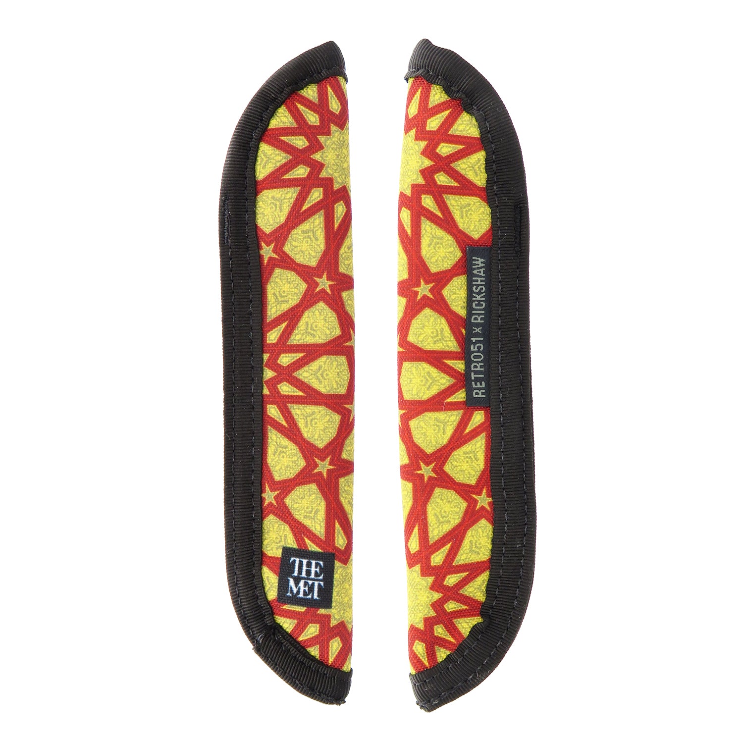 The front and back panel views of the double pen sleeves with blue, red and yellow geometric designs. THE MET logo is featured at the bottom.