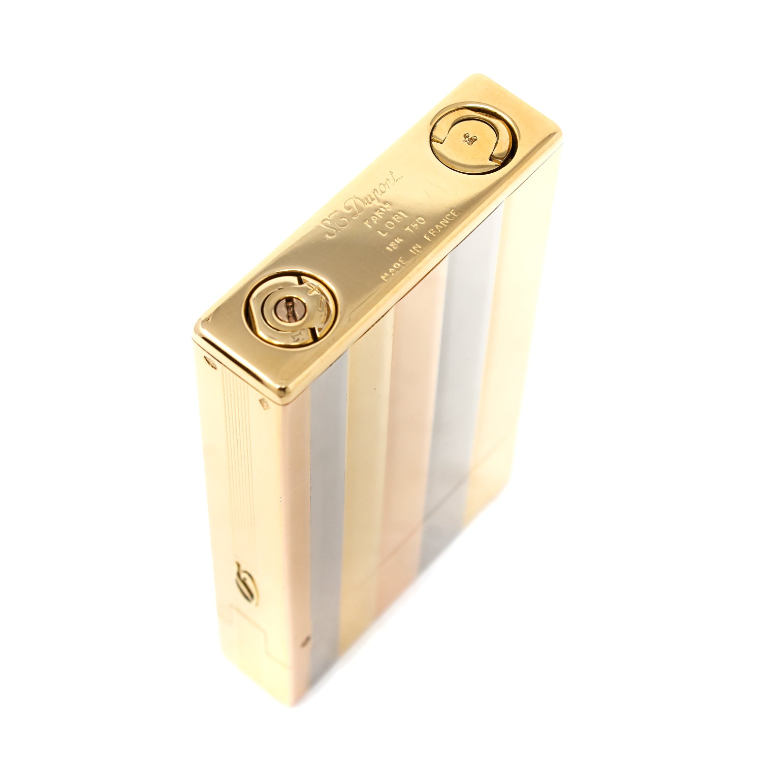 This lighter features a solid layered gold body consisting of yellow, white, and rose gold. The spin wheel is covered in rows of Diamonds, this is a one-of-a-kind creation.