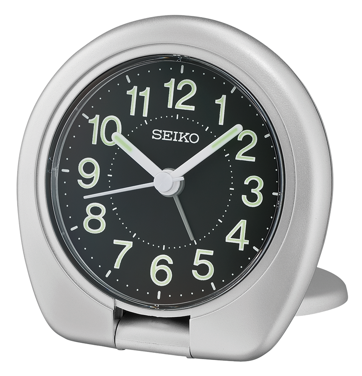 Traveling made easy with this travel clock. It has a silver compact and metallic silver case with folding stand. The ascending beep alarm with snooze and light function by pressing the screen. The luminous hands are perfect for reading in low light.