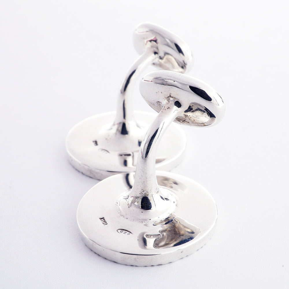 Close up to the stamped hallmarks on the back of the cuff link, confirming it is .925 sterling silver.