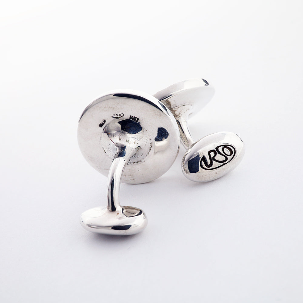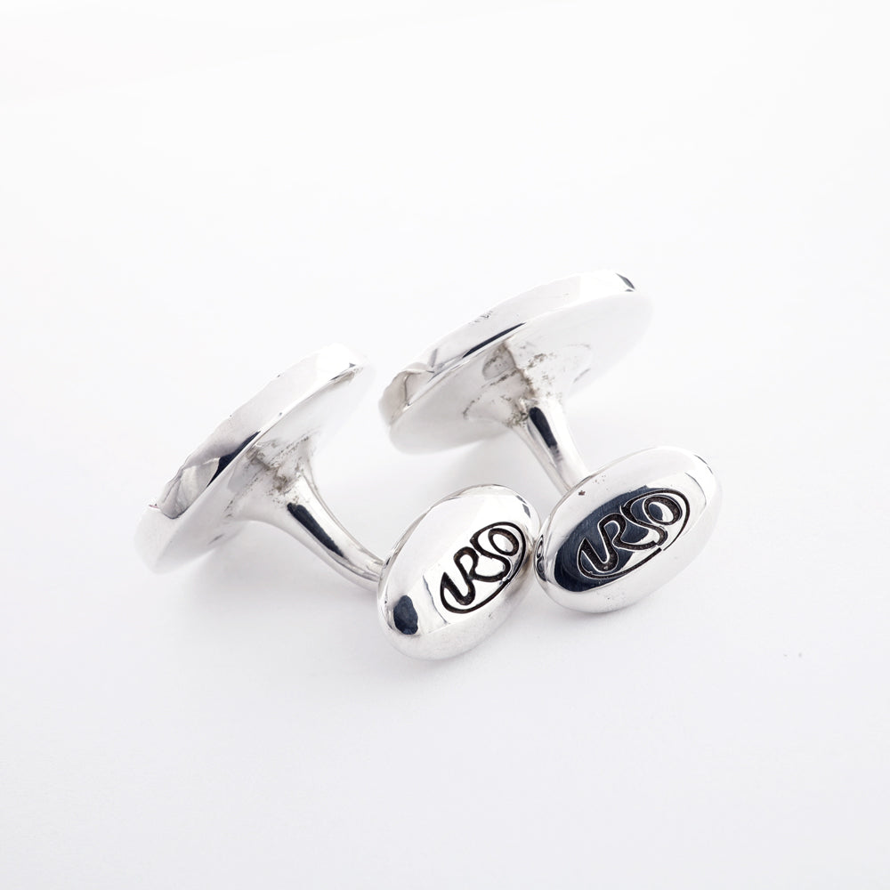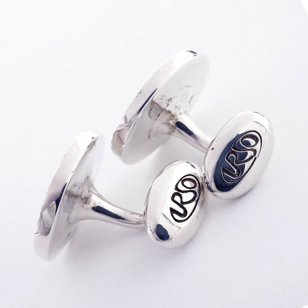 Silver cufflinks showing the engraved URSO logo on a light gray background