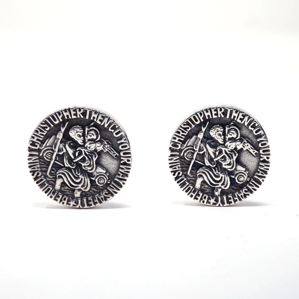• Load image into Gallery viewer, Two circular cufflinks with engraved design on a white background. The engraved text around the design reads: "BEHOLD SAINT CHRISTOPHER THEN GO YOUR WAY IN SAFETY"